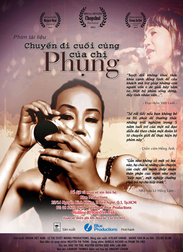 Au milieu du hall d’entrée, qui sert d’ordinaire aux expositions, une femme semble retenir toute l’attention. Elle est entourée d’un essaim de journalistes et de spectateurs. Normal, c’est Nguyễn Thị Thắm, la réalisatrice du film, qui s’efforce de présenter son travail en quelques mots : « Le dernier voyage de Madame Phung » est mon premier long métrage documentaire. Après avoir fait trois ateliers Varan Vietnam en 2005, j’ai décidé d’emprunter la camera de mon prof pour filmer mes aventures. En fait, je dois dire qu’au départ, je n’aurais jamais pensée faire un film sur le troisième sexe. C’est en 2010, au cours d’un voyage dans le Sud, que j’ai rencontré par hasard madame Phụng et sa troupe artistique. J’ai tout de suite décidé de me joindre à eux et honnêtement, j’ai trouvé que j’avais à faire à des femmes comme toutes les autres…»