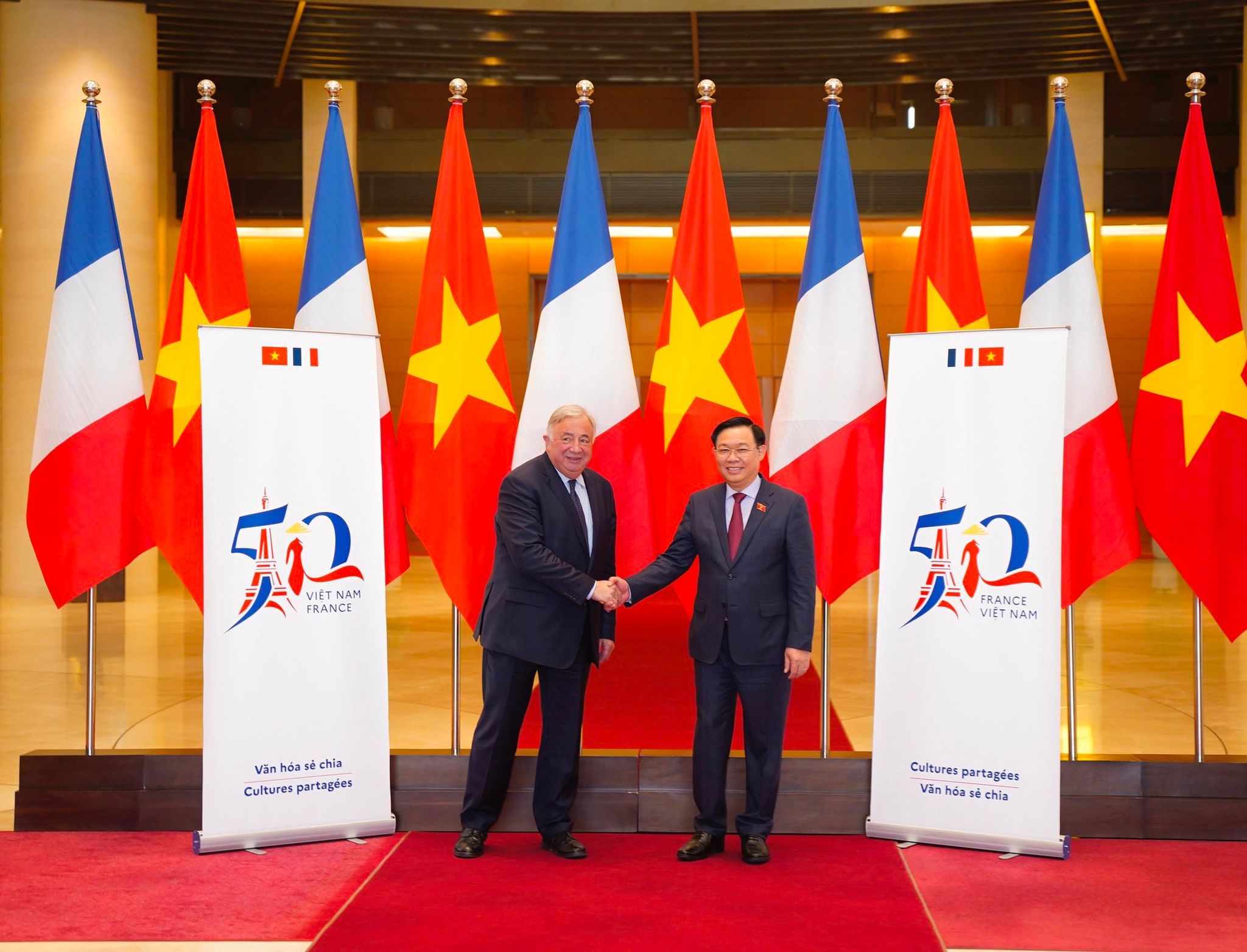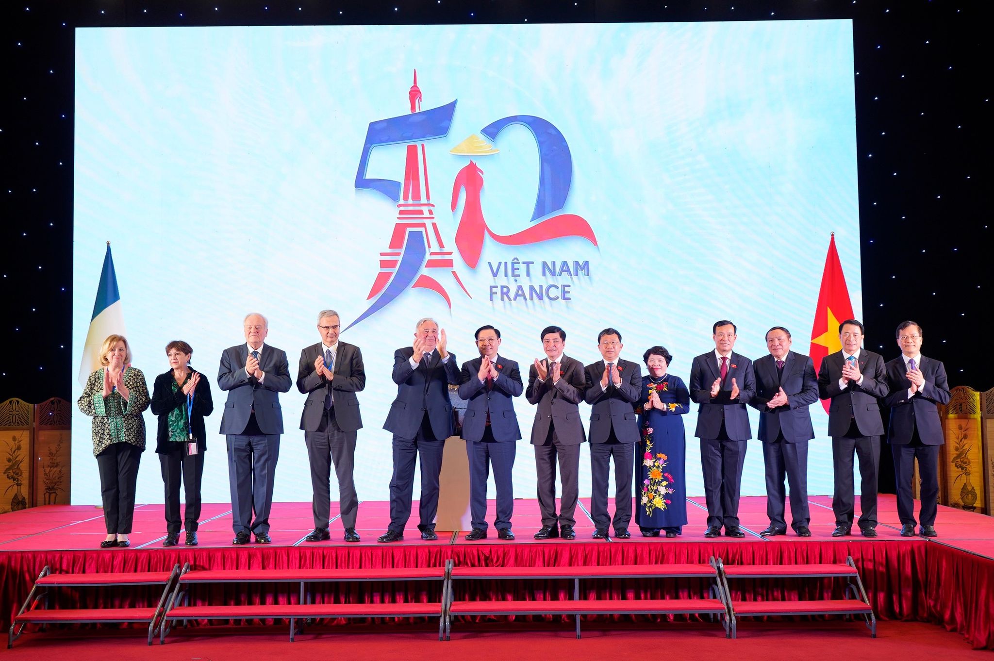 Gérard Larcher et Vuong Dinh Huê ont dévoilé ensemble le logo officiel des 50 ans de l’établissement des relations diplomatiques franco-vietnamiennes. Ce logo exceptionnel entremêle ce chiffre emblématique avec des symboles de chaque pays - la Tour Eiffel de France et l’áo dài du Vietnam - dans les couleurs nationales.