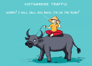 L’auteur de ces cartes est un certain « LAM », un nom que l’on attribuerait volontiers à un Vietnamien, mais qui n’est en fait que le pseudonyme de Thibaut Croquevielle, Français de raison, mais Vietnamien de coeur. Dès son premier séjour au Vietnam en 2009, ce graphiste normand est tout de suite tombé sous le charme du pays des scooters, si bien qu’il a décidé de s’y installer pour de bon et de créer, en 2014, sa propre société. « La première fois que je suis allé au Vietnam, c’était par le biais d’une association caritative. Mon frère et moi, nous parrainions deux filleules, une à Cao Bang et une à Hoi An. C’est comme ça que j’ai découvert Hoi An. Ça a vraiment été un choc culturel. Et puis c’était la première fois que je voyageais, que je prenais un avion, que je découvrais un pays asiatique... En débarquant à Hanoi, j’ai tout de suite été frappé par les fils électriques, par plein de choses qui étaient très nouvelles pour moi. C’est ce qui m’a donné l’envie de créer des cartes postales humoristiques, en partant de ce qui frappe les touristes. Il y a des choses, comme ça, qui paraissent absolument normales pour un Vietnamien, mais qui sont ahurissantes pour un touriste étranger. »