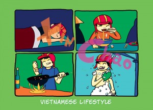 Grâce à un sens de l’observation aiguisé et un sens de l’humour qui ne l’est pas moins, Thibaut a réussi à saisir tous ces petits riens qui font l’ébahissement des touristes, sur le mode caricatural. Le Vietnam, tel qu’il apparaît sur ses cartes postales, c’est une famille de cinq ou six personnes sur un scooter, une femme couverte de la tête aux pieds pour se protéger du soleil, un homme qui circule dans la rue chargé comme un mulet... On reconnaît immédiatement le Vietnam, d’autant plus que Thibaut a inséré subtilement quelques petits détails qu’on trouve nulle part ailleurs : les entrelacs de fils électriques, les chapeaux coniques... Mais surtout ce sourire qui pour lui, caractérise si bien les Vietnamiens.