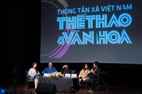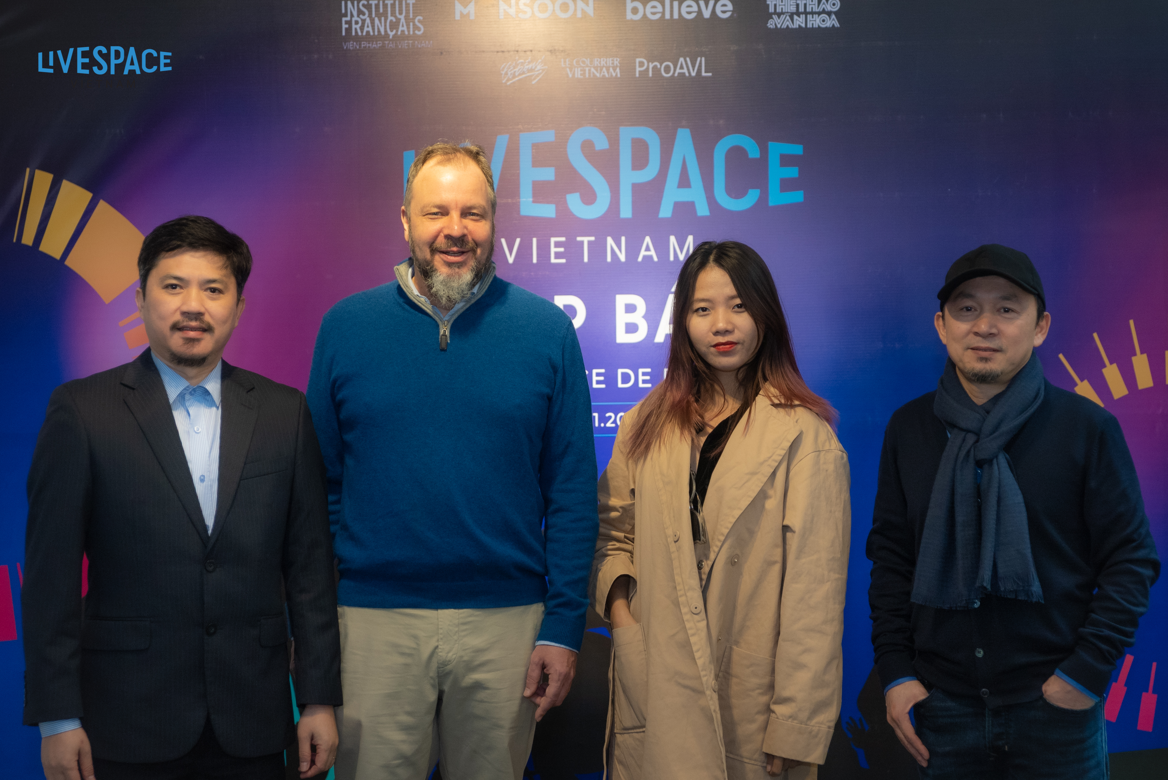 Le comité d'organisation dont Thierry Vergon, le directeur de l'Institut français (2e à gauche), Tôn Nu Nhu Ngoc, représente de Believe au Vietnam et Nguyên Quôc Trung, le directeur artistique du festival Monsoon (à droite) |