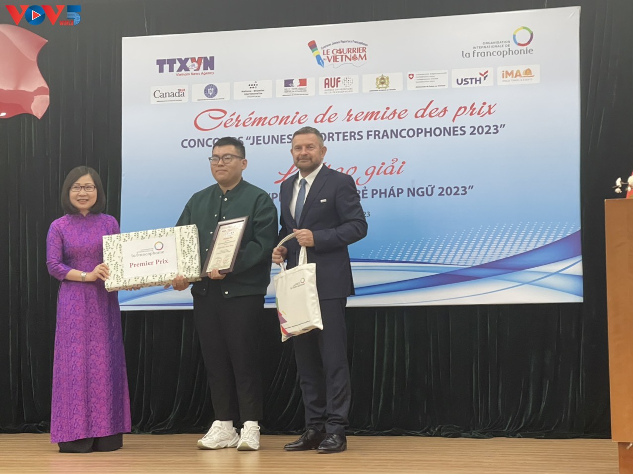 Nguyên Duc Minh Hoàng (centre) reçoit le Premier prix, remis par le représentant régional pour l'Asie et le Pacifique de l'OIF, Edgar Doerig, et la directrice générale adjointe de la VNA, Doan Thi Tuyêt Nhung. Photo: Thuỳ Linh/VOV5 |