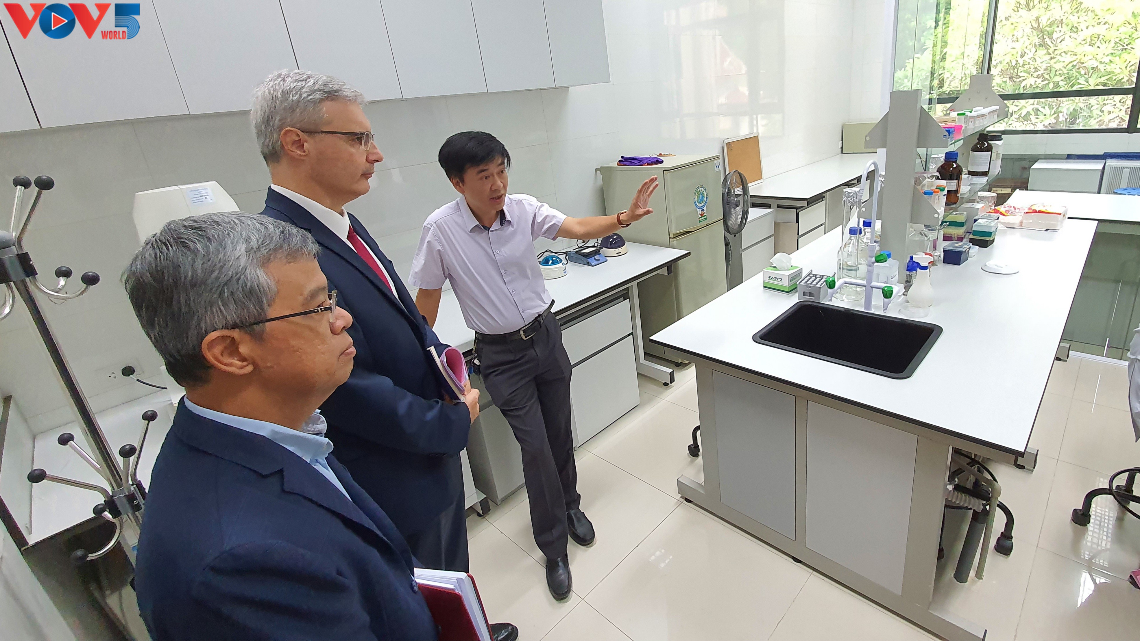 L’ambassadeur de France se rend dans les laboratoires high-tech de l’Institut national d’Hygiène et d’Épidémiologie de Hanoi. Photo: Duc Quy/VOV5 |