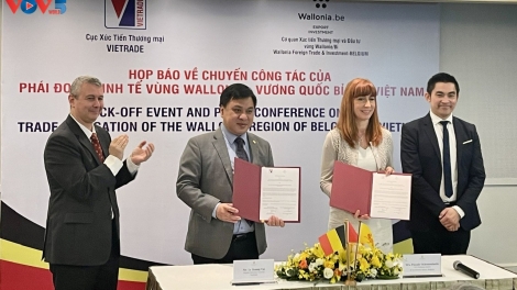 (VOVWORLD) - Ce lundi matin à Hanoi, Lê Hoàng Tài, directeur général adjoint du Département de promotion du commerce (Vietrade), et Pascale Delcomminette, directrice générale de l'Agence wallonne pour les exportations et les investissements étrangers (AWEX), en visite d'affaires au Vietnam, ont signé une lettre d'intention de collaboration entre les deux entités.