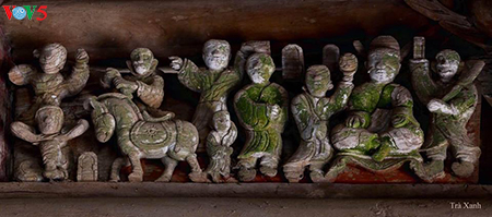 Restons à Bac Ninh, et intéressons-nous maintenant à la maison communale de Diêm, qui remonte au 17ème siècle. Sa travée centrale est précédée d’un portique en voûte, lui-même orné de sculptures de dragons, de nuages, de fleurs de lotus. Mais puisque l’on parle de sculpture, l’édifice en possède d’autres, d’inspiration toute campagnarde : les 8 fées, les jeunes paysannes, les joueurs d’échecs… Dinh Tiên Hai, peintre et expert architecture villageoise :
