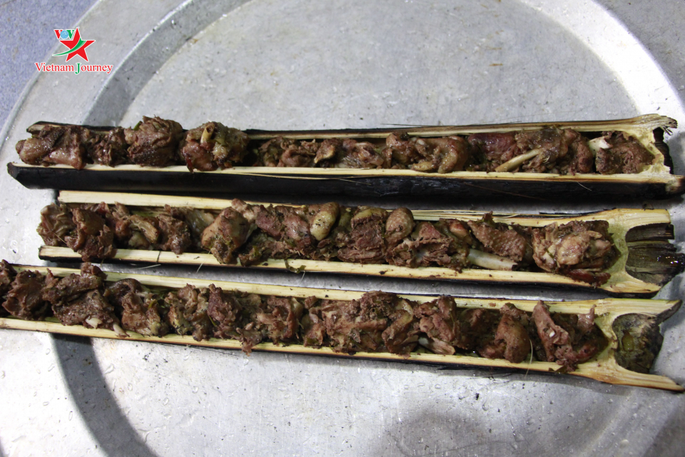Le tube rempli passera alors au feu doux et sera tourné régulièrement pour que la viande cuise progressivement sans carboniser. Cette étape, cruciale, dure au moins une heure et demie. Résultat: un plat exquis qu’on peut manger avec du riz ou déguster avec de l’alcool.
