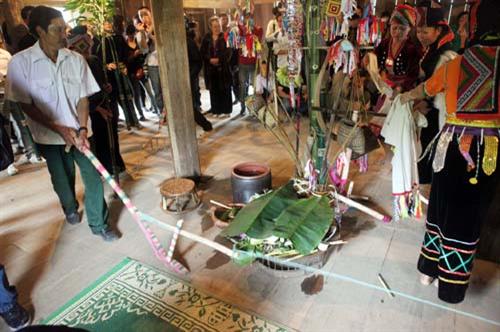 Le maître de cérémonie fait abattre deux porcs, l’un pour les rituels, l’autre pour mettre sur l’autel des ancêtres. Les anciens patients devenus enfants adoptifs du chaman viennent avec des volailles, du riz gluant, de l’alcool, des fruits… La cérémonie a lieu dans la travée centrale de la maison du chaman. Y sont dressés une perche, un bananier, une canne à sucre sur lesquels les villageois accrochent des effigies d’animaux en bambou tressé, des oiseaux, des cigales, des chevaux, ainsi que des fleurs. Le chaman invoque les ancêtres et les divinités de tous coins, les priant d’apporter une vie sereine et prospère aux communs des mortels.