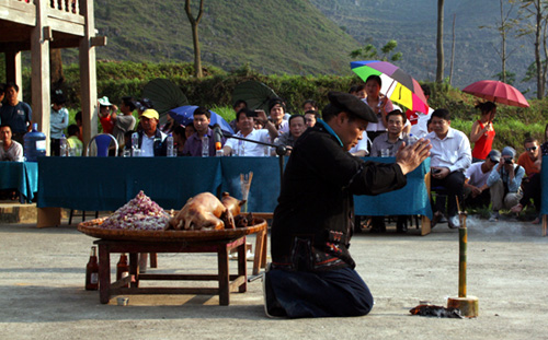 Sans ce rituel d’invocation à la pluie, pas de récolte abondante... Et sans récolte abondante, pas de prospérité, ni de bonheur... Autant dire que cette cérémonie, qui est organisée au cours du troisième mois lunaire, est absolument indispensable aux Lolos. Lo Sy Pao, chef du hameau de Sung Pa A, un hameau du district de Meo Vac :