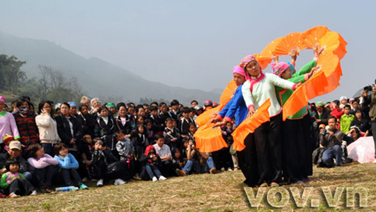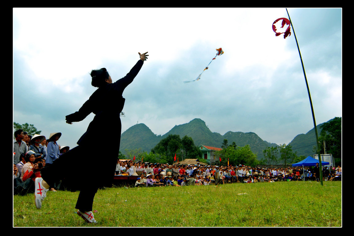 D’abord, on érige un mât d’abricotier au sommet duquel est accroché un cercle recouvert de papier rouge d’un côté - symbole du soleil, et jaune de l’autre - symbole de la lune. Deux équipes se forment : une équipe féminine et une équipe masculine. Le jeu est simple : il s’agit d’envoyer une balle d’étoffe à l’équipe adverse en perforant le papier !... C’est de bon augure pour la moisson paraît-il. Van Van Ngan, de la province de Lào Cai : « Le mât d’abricotier mesure entre 10 et 20 mètres de haut, alors que le cercle symbolisant le soleil et la lune est très petit : 50-60 centimètres de diamètre, pas plus ! Et il faut absolument réussir à le perforer, sinon, le village sera hanté de la malchance. »