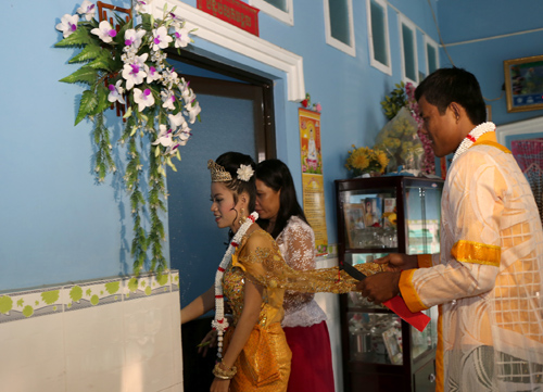 Chez les Khmers, même si le mariage est une institution civile, la cérémonie religieuse est beaucoup plus importante. D’ailleurs des bonzes sont conviés. Ils récitent généralement des prières en aspergeant le couple d’eau bénite parfumée, en signe de bonheur et de longévité. Ensuite, ils lient les mains des jeunes mariés avec un fil de coton rouge, pour signifier qu’ils sont désormais unis à tout jamais, pour le meilleur et pour le pire.