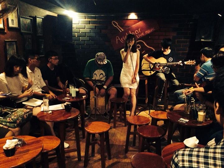 C’est cette ambiance mélodieuse qui fait le succès d’Acid Bar, un petit établissement de l’arrondissement Ba Dinh, à Hanoi, ouvert il y a deux ans et demie. Du lundi au vendredi, on y entend des chansons vietnamiennes. Le week-end, par contre, on y entend de tout, pourvu que ça ne soit pas vietnamien : des tubes anglais, sud-coréens et parfois même français... Tout y passe ! Huy Dat, propriétaire de ce lieu de « culte » : « Ce que je veux proposer, ici, c’est de l’acoustique pur. Vous ne trouverez jamais de disques ! Tous les soirs, j’invite des musiciens, des chanteurs et des chanteuses qui sont tous très jeunes mais bourrés de talent. En général, ils sortent d’émissions de télé-réalité comme The Voice, Vietnam Idol, etc. Mais ce n’est pas tout ! Si parmi les clients, quelqu’un se sent les tripes de monter sur scène, il peut tout à fait le faire ! »