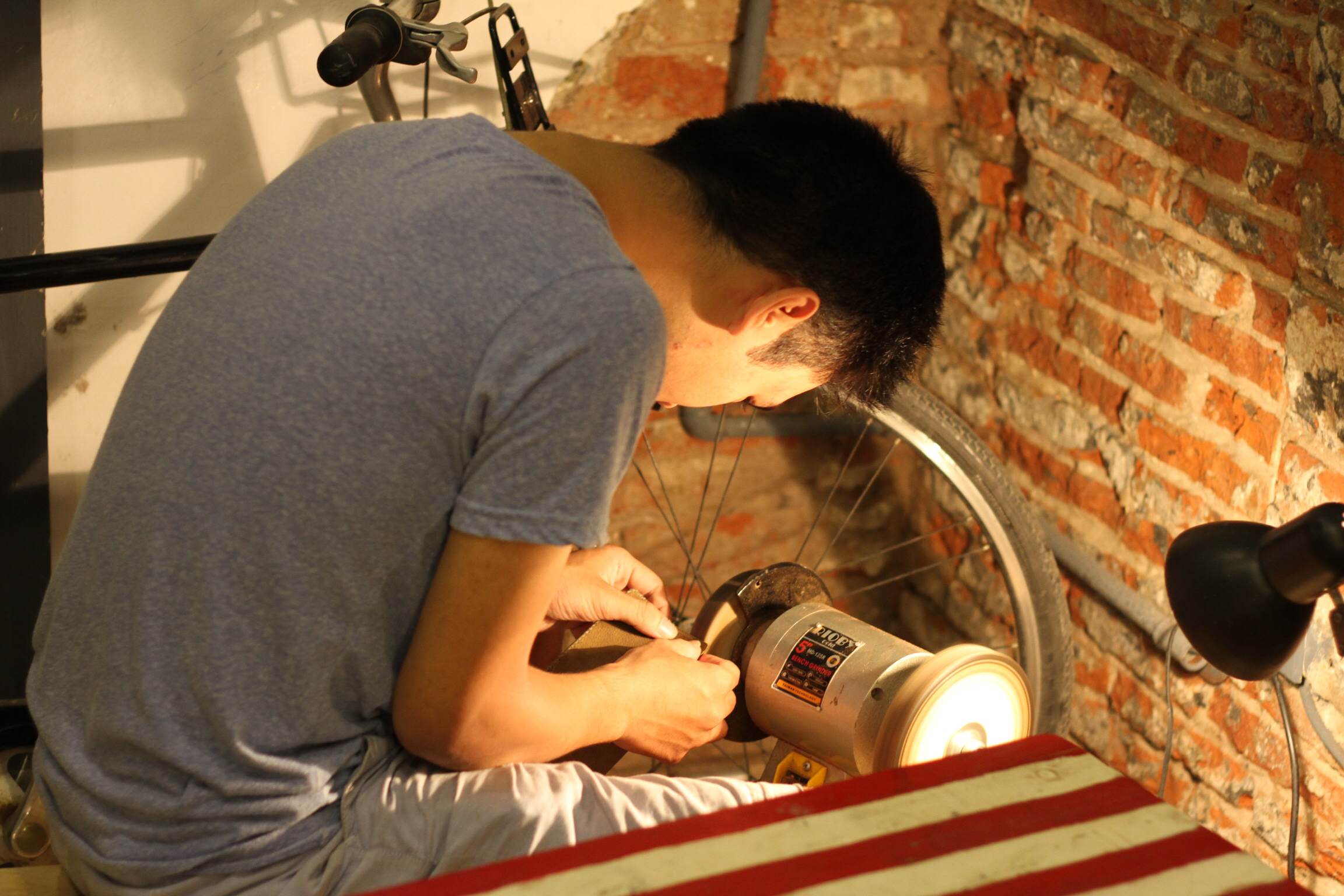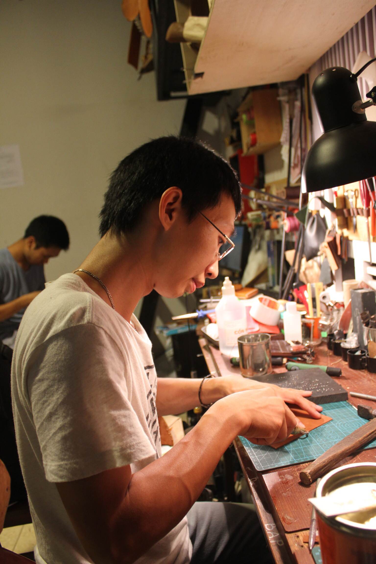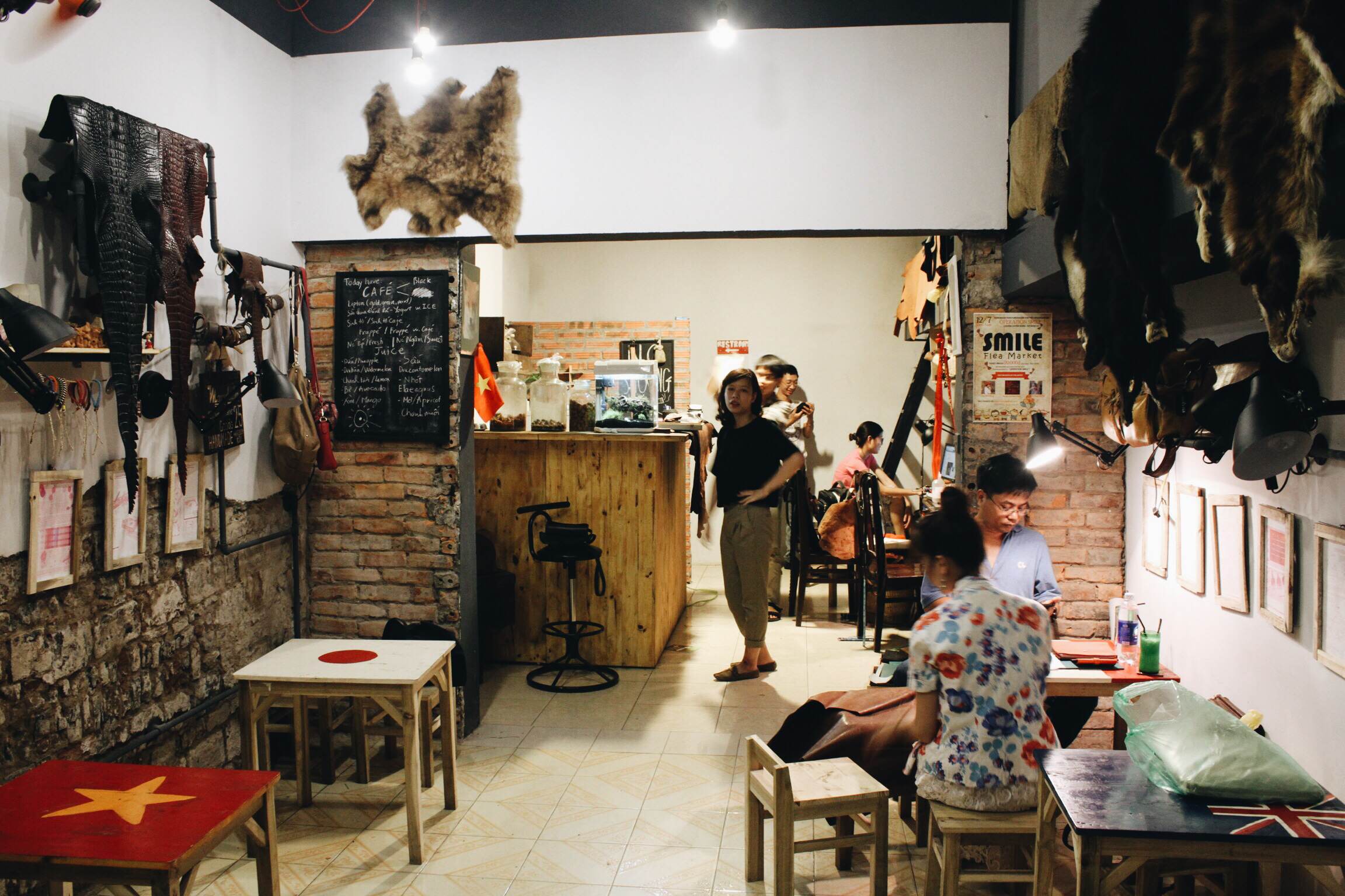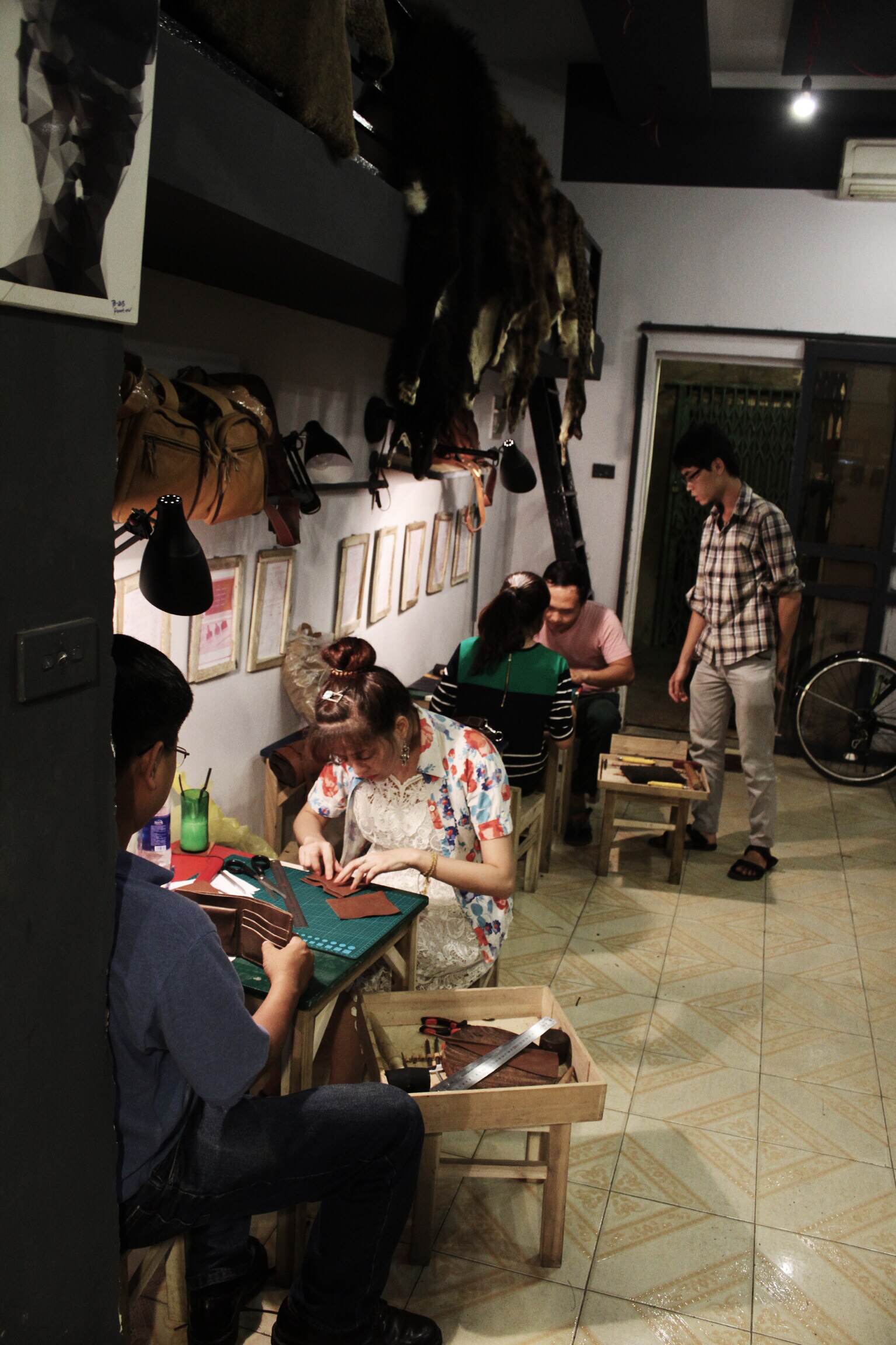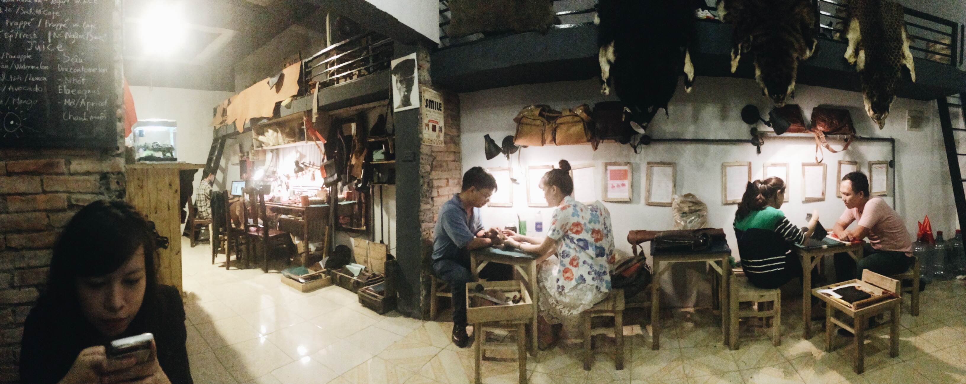 Mais que l’on ne s’y méprenne pas, il s’agit avant tout d’un atelier artisanal, où Nguyên Tuân Dung et ses employés, également compagnons, fabriquent et aident à fabriquer des accessoires en cuir. Pas difficile d’identifier le patron, c’est ce jeune homme souriant aux lunettes épaisses, qui passe de table en table pour aider ses clients. Il confie : « J’ai créé cet atelier d’abord pour fabriquer les accessoires en cuir et traiter des commandes. Mais mes amis souhaitaient que je leur apprenne à faire ces objets par eux-mêmes et ils voulaient aussi avoir un espace de rencontre. J’ai alors eu l’idée d’ouvrir ce petit café. Au début j’ai rencontré plusieurs difficultés. Il faut dire que j’ai dû abandonner le métier que j’exerçais depuis déjà 3 ans et que ce n’était pas de nature à rassurer tout le monde. Et c’est sans compter les loyers qui sont particulièrement élevés, ici, dans ce quartier très touristique.