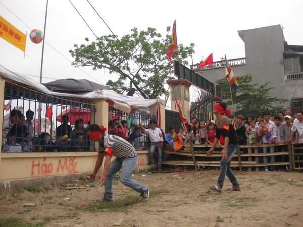 Réagissant à un long coup de sifflet de l’arbitre, trois jeunes hommes aux yeux bandés escaladent la haie de l’écurie qui se trouve au milieu du terrain. Ils inclinent la tête, essaient d’entendre les bruits que font les quatre sabots d’un bouc tout en tâtonnant dans une ambiance tumultueuse. Tout autour, la foule est enthousiaste. Ça siffle, ça rit, ça crie… Mais qui est la vedette qui suscite une telle furia ? L’un des trois jeunes hommes ? Non. C’est le bouc ! Eh oui, le bouc ! Ce jeu, c’est en fait une partie de colin-maillard qui consiste à attraper le bouc les yeux bandés. C’est d’ailleurs la spécialité de Cao Trung. Le règlement du jeu ? Très simple, les participants ont cinq minutes, pas une de plus, pour attraper l’animal à l’aveuglette. Quant au trophé du vainqueur, il consiste en une somme de 200.000 dongs, à quoi s’ajoutent les applaudissements de la foule. Nguyễn Duy Dần, membre du comité organisateur, nous confie : « C’est notre jeu folklorique. Tout le monde peut y participer, sans distinction d’âge ou de sexe. Si les joueurs sont heureux, c’est tant mieux ! ».