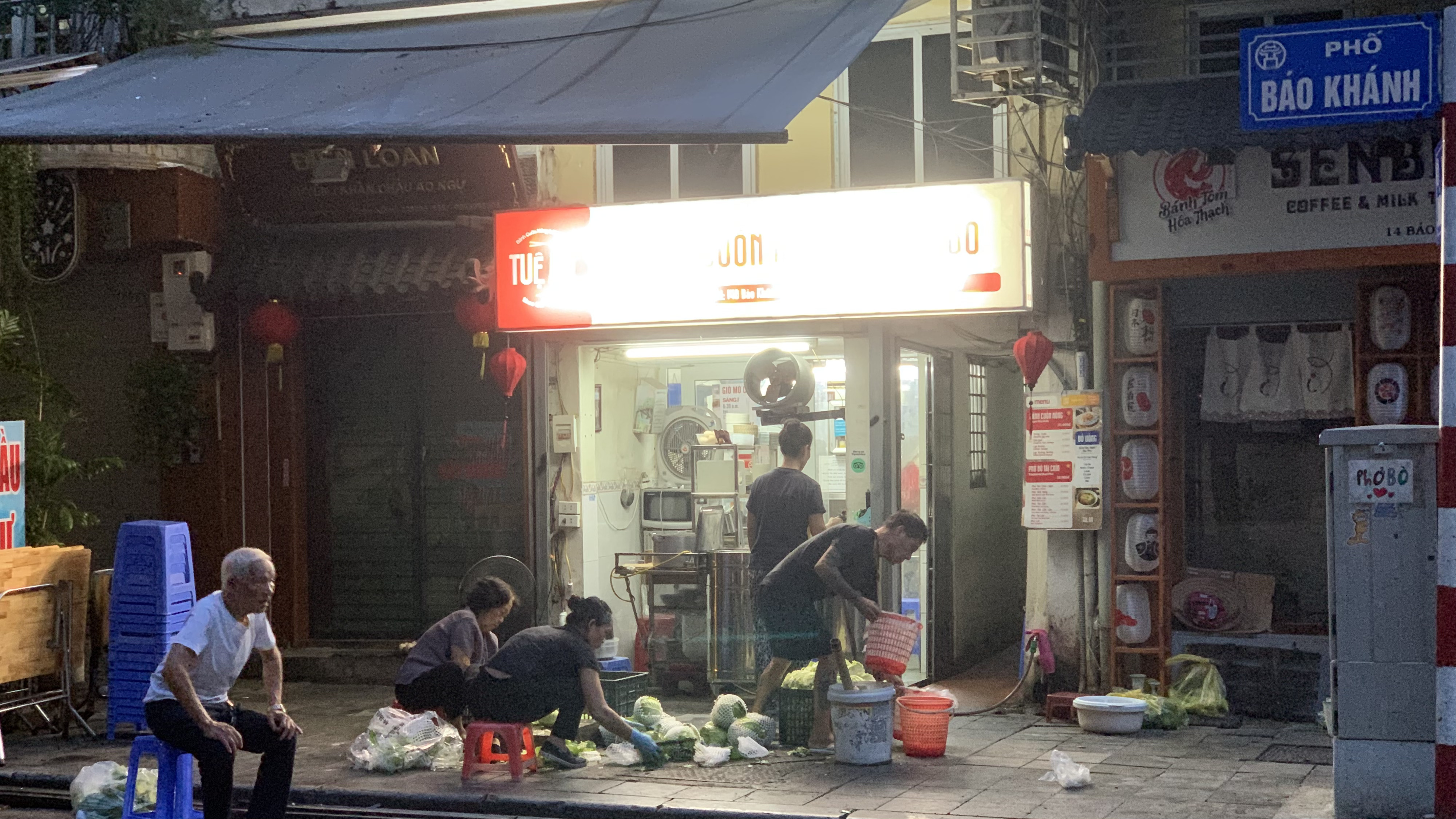 Dès les premières lueurs de l’aube, la petite rue Bao Khanh (arrondissement de Hoàn Kiêm, Hanoï) commence à s’animer. Cliquetis des couteaux, marmites en ébullition… Le va-et-vient des premiers préparatifs réveille doucement le quartier. Une nouvelle journée commence… comme toutes les autres, ou presque.