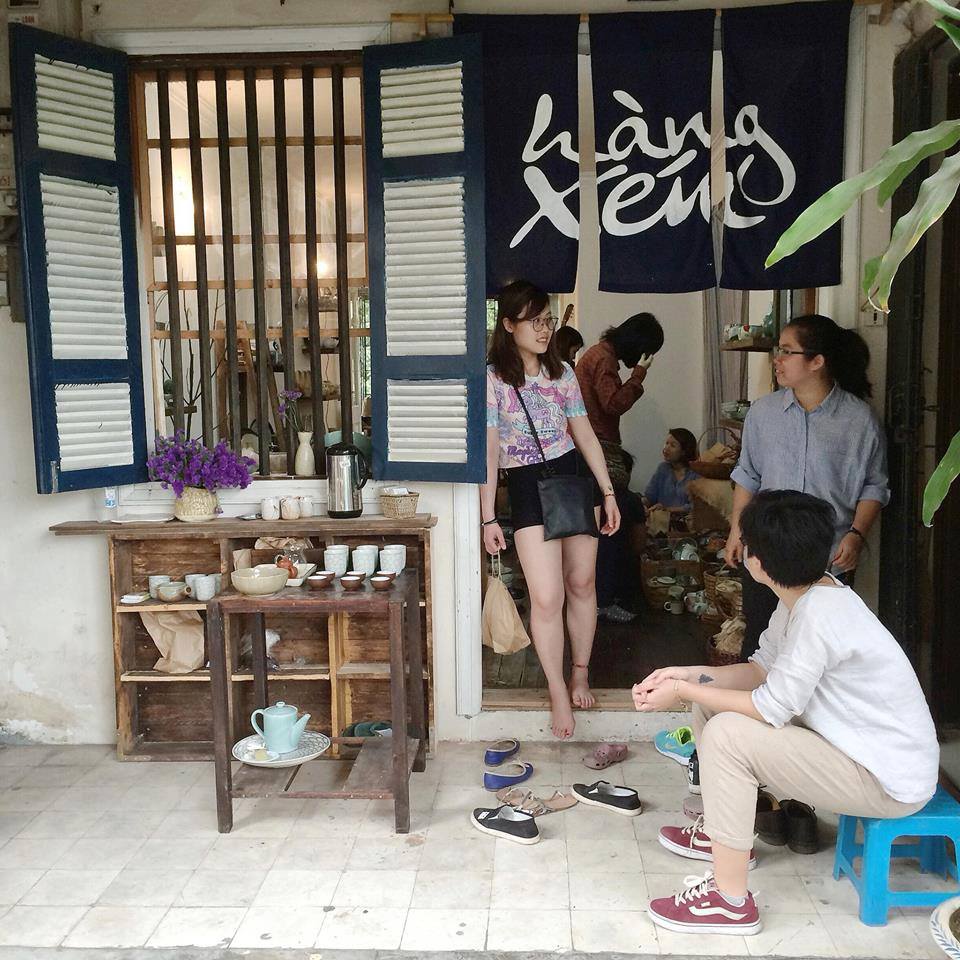 Huyên m’amène à l’une de ses adresses habituelles. Nichée au quatrième étage d’un immeuble collectif de la rue Ngô Quyên, la boutique n’est pas d’un accès très aisé, mais elle est de celles qui valent le détour. Porte coulissante de bois, rideau Noren bleu marine, table basse en bambou, espace parfumé par l’encens de santal... Xén - c’est le nom de la boutique en question - nous plonge en plein Japon d’estampe…