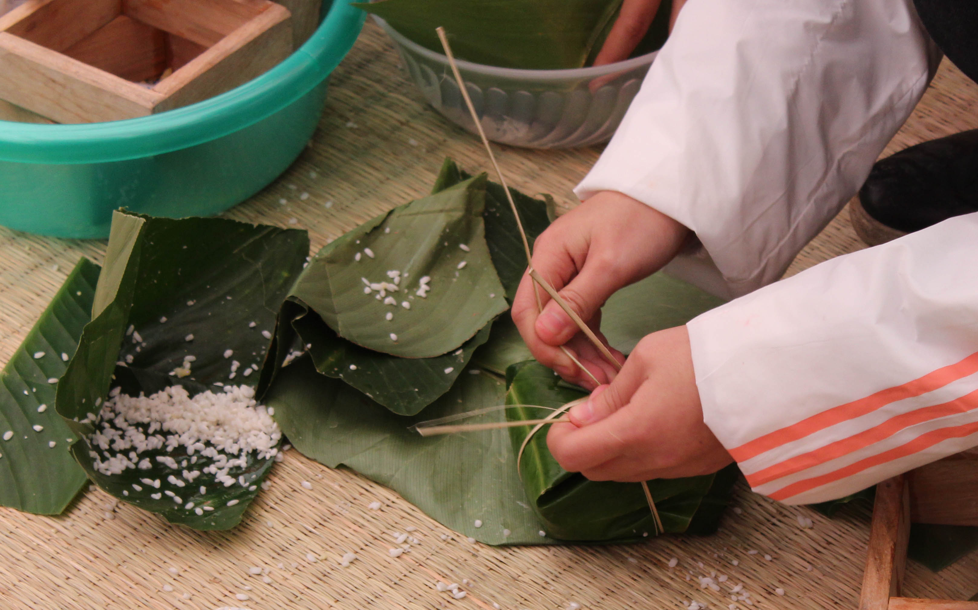 « C’est aussi la première fois que je mets la main à la pâte, mais tout le monde me dit que je m’en sors bien. La partie délicate, c’est quand il faut envelopper le tout dans des feuilles en serrant bien », dit-il.