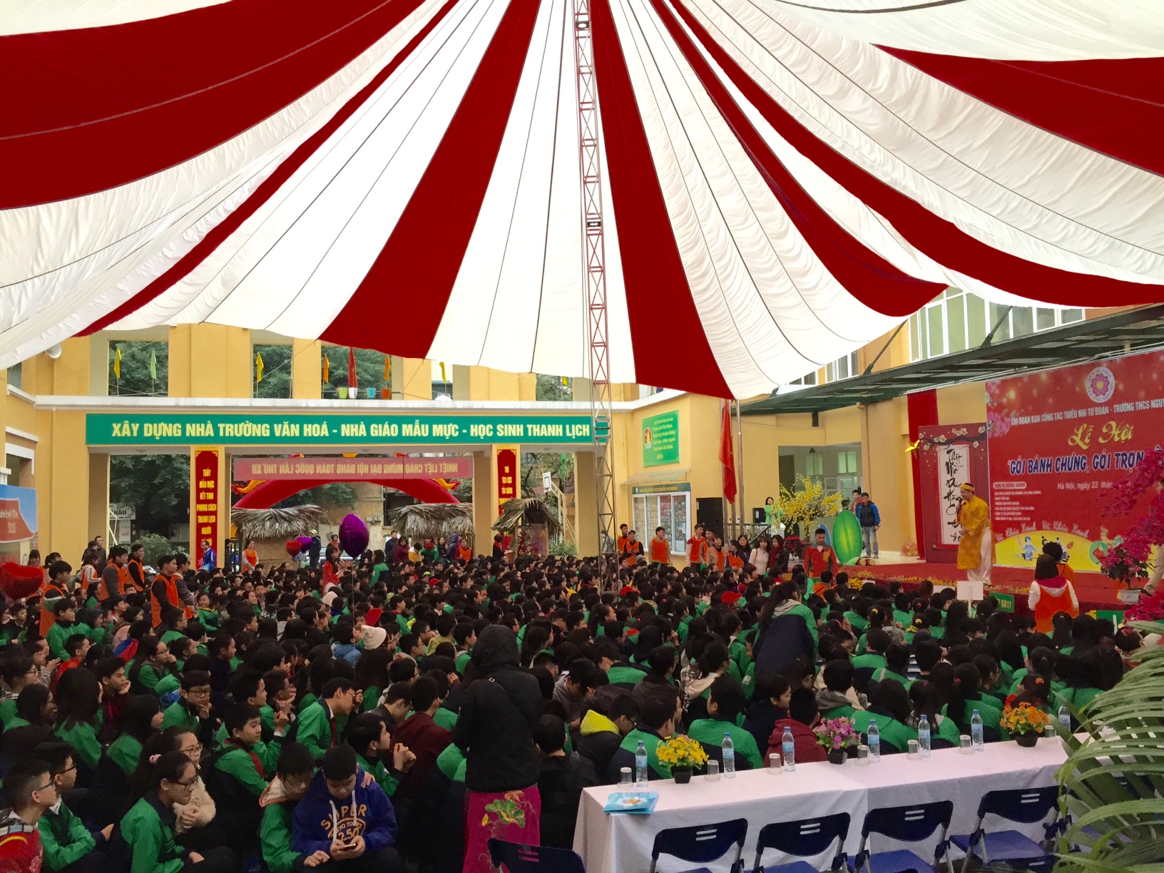 C’est le collège Nguyen Tri Phuong qui accueille aujourd’hui cette activité humanitaire. Sur des nattes étendues au milieu de la cours, une centaine d’élèves sont en train de confectionner des bánh chưng. Un peu de riz gluant, un peu de haricot mungo, un morceau de viande de porc au milieu et le tout est enveloppé dans des feuilles de phrynium avec l’aide de liens de bambou... Et voilà, le tour est joué ! Facile à dire, mais à faire, c’est une autre histoire !... Voici ce qu’en dit Kieu Trinh, l’une des élèves du collège : « C’est la première fois que j’enveloppe un bánh chưng. Pas facile ! Heureusement que mes professeurs et les jeunes de l’Union de la jeunesse communiste m’ont aidé ! Et voilà le travail ! Joli, hein ? Moi, en tout cas, je suis super-contente ! »