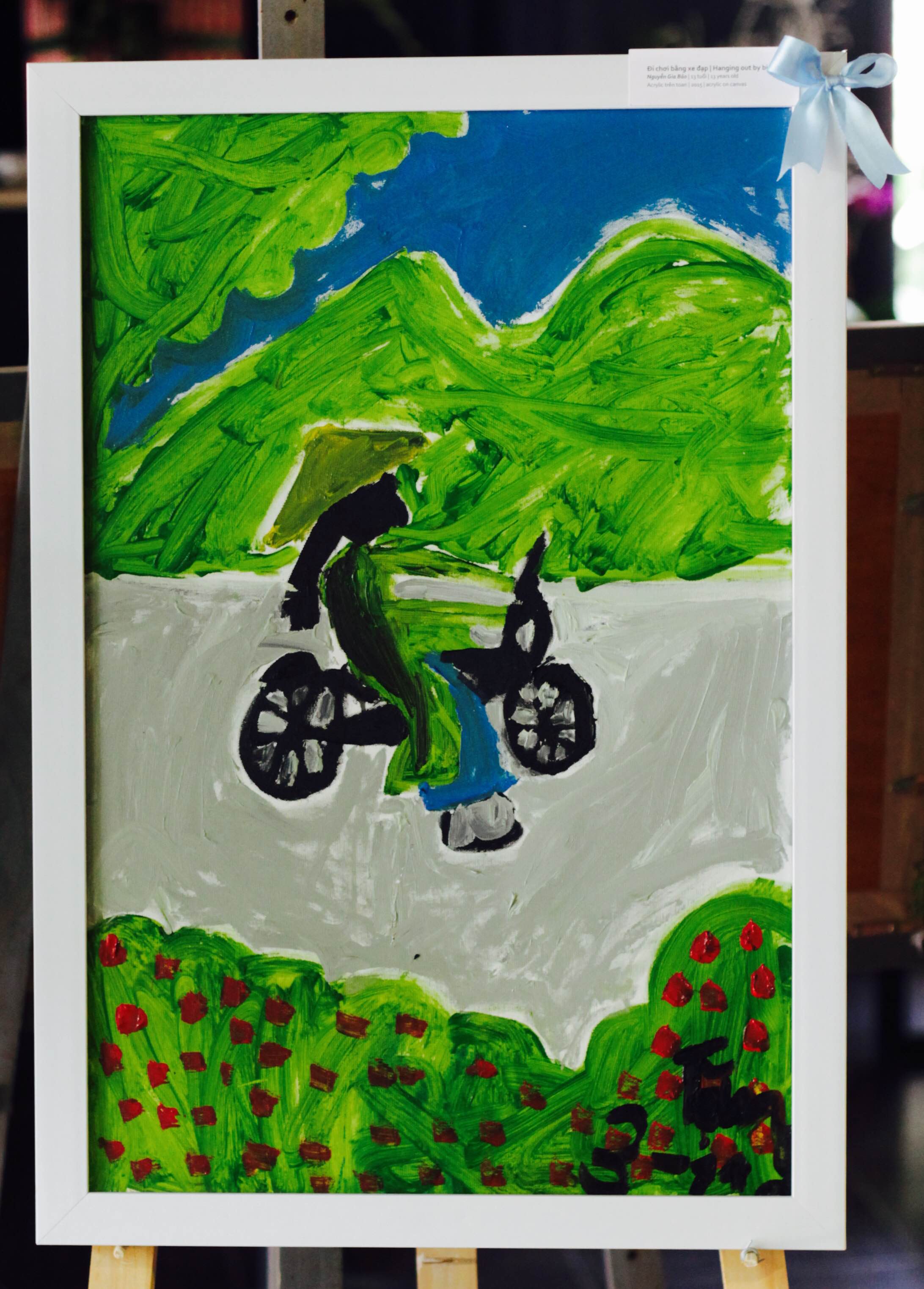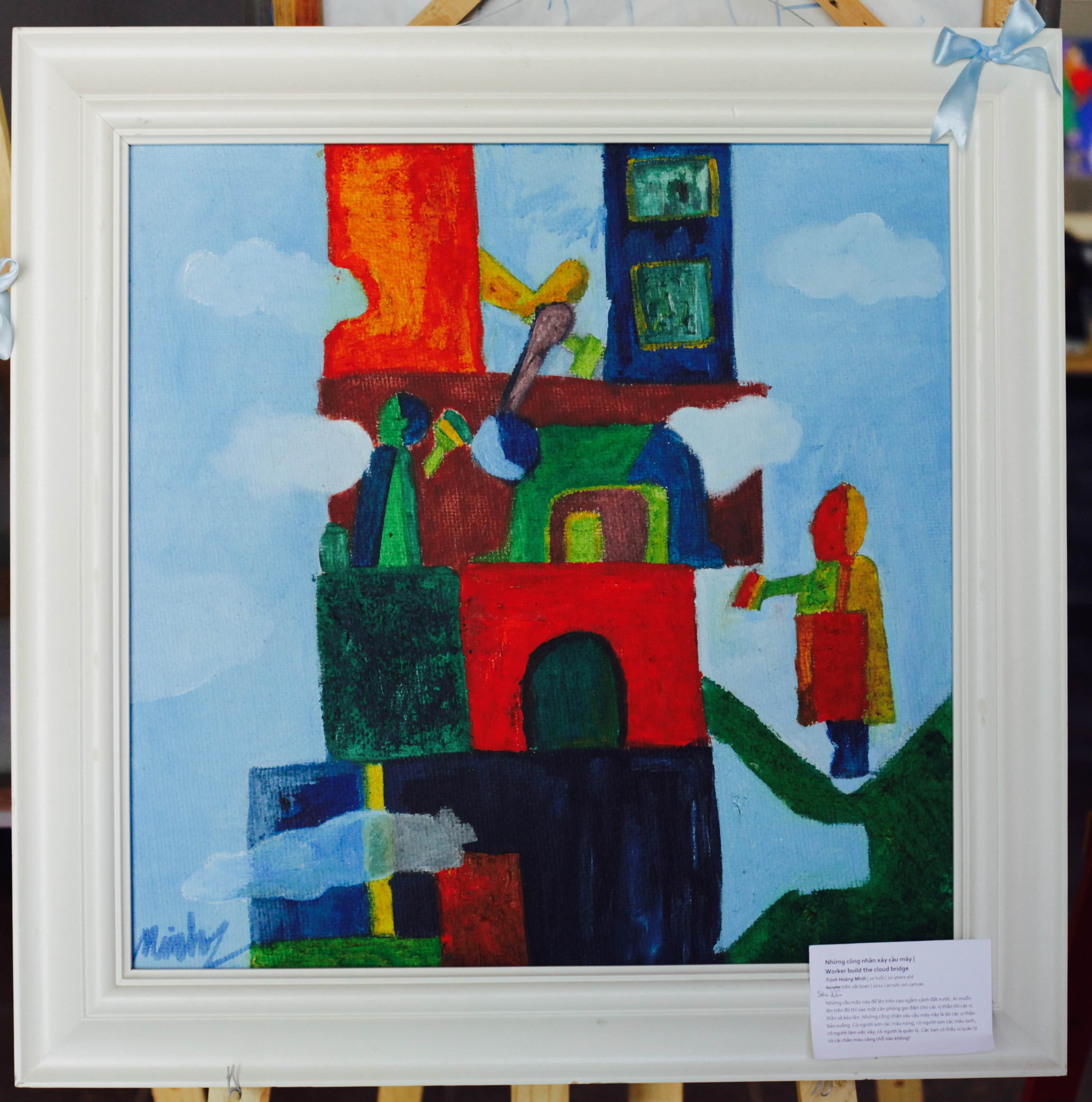 « J’aime les cuisses de poulet », « Sortie entre amis », « Chèvre », « D’après des estampes de Dông Hô », « Ouvriers construisant un pont en nuage »… Des plats et des animaux qu’ils préfèrent jusqu’à des choses qui n’existent que dans leur imagination, les 5 petits artistes nous emmènent dans un monde multidimensionnel plein de poésie. Lê Thiêt Cuong : "Quand je regarde leurs dessins, il y a une chose qui me frappe : ces enfants sont dans une situation à priori problématique, mais ces oeuvres restent empreintes d’optimisme, de confiance, de joie... Moi qui suis un adulte heureux et aisé, je ne saurait pas créer des peintures aussi naïves, pures et joyeuses."