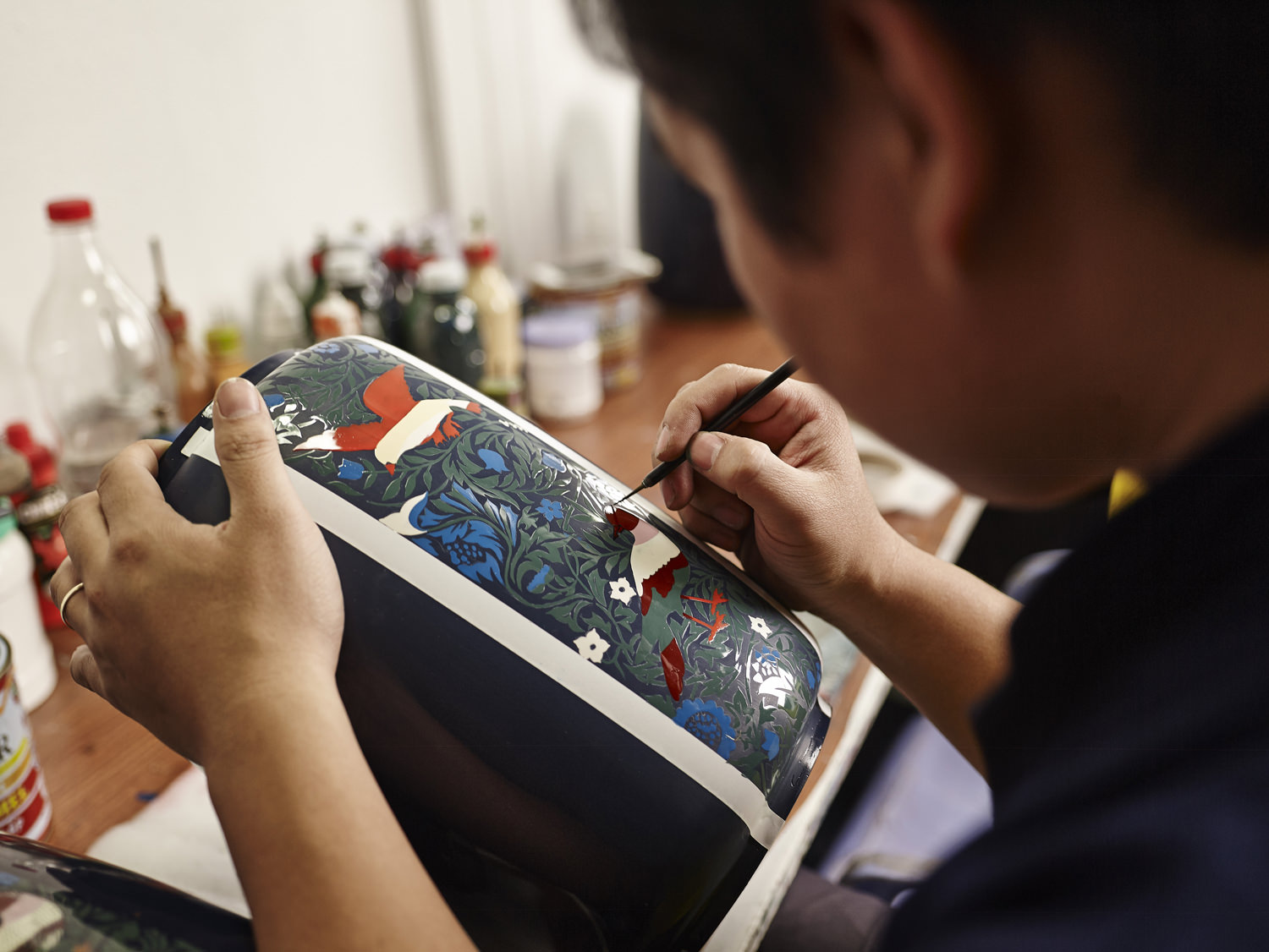 Christian de Ruty : Dans le monde il n’y a que trois pays de laque : le Vietnam, le Myanmar, et le Japon. Mais en fait il y en a la quatrième, c’est la France. La France, depuis le 18ème siècle, a une tradition très forte de laque grâce aux frères Martins. Et donc c’est pour ça, cette connaissance de la laque française et cette proximité avec cet artisanat extrêmement vietnamien et très asiatique qui a immédiatement créé le lien. Nous avons d’autres artisanats en commun, la vannerie par exemple, nous aurions pu commencer par la vannerie, mais on a commencé par la laque, parce que c’est un produit qui exprime des couleurs, dans lequel on peut travailler sur énormément de choses. Alors l’idée c’est de développer une création exceptionnelle, différente de tout ce qu’on trouve, sur un produit où il y a beaucoup de possibilités.