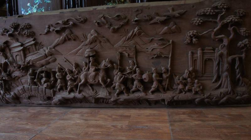 « Au Vietnam, c’est au 11ème siècle que la xylogravure a fait son apparition, dans les pagodes. Par la suite, c’est devenu un outil de propagande très efficace, particulièrement en temps de guerre, avec des sentences gravées du type « l’union fait la force »… Autrefois, du bois, on en trouvait très facilement et à par le pin, on peut graver dans toutes sortes de bois. »