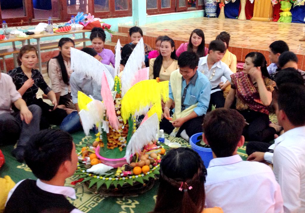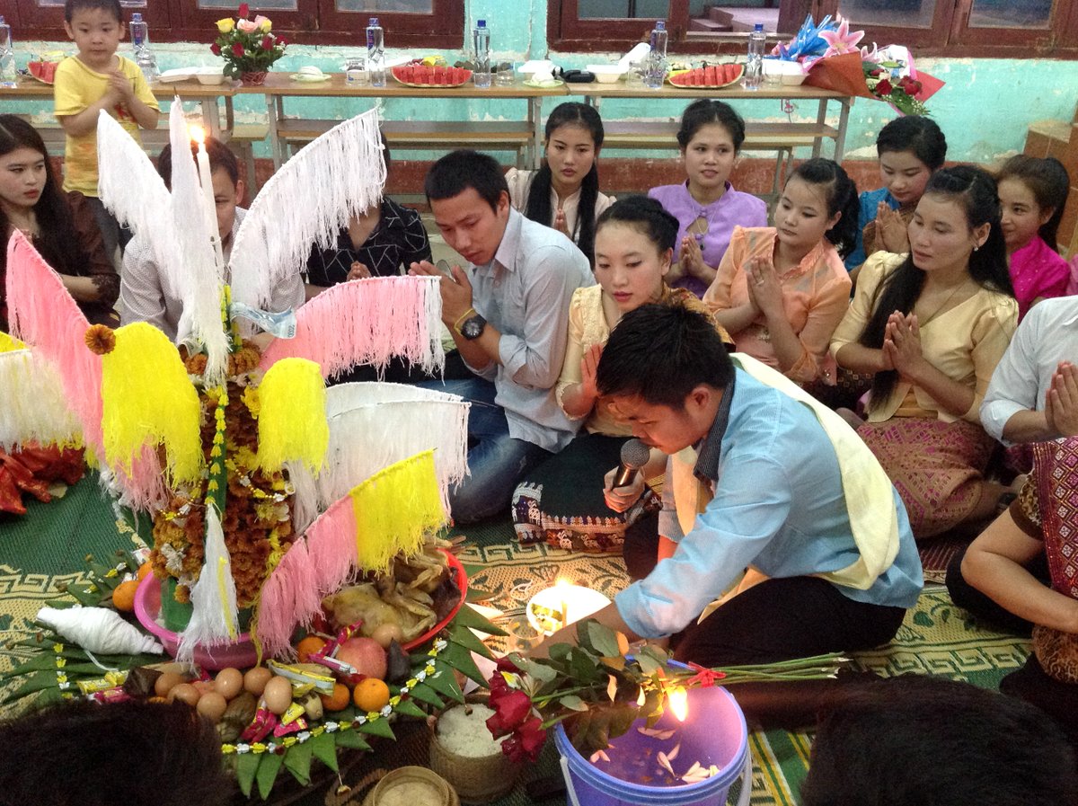 Dans la salle de réunion de l’Institut de la Santé publique du Nord-Ouest aujourd’hui, des étudiants venus du « pays du million d'éléphants » sont agenouilles, les mains jointes, devant un autel fleuri garni de victuailles : c’est ainsi qu’ils célèbrent le « baci », aussi appelé « soukhouane », qui est l’une des cérémonies traditionnelles importantes du « pimaï », le Nouvel an traditionnel laotien. Lang, l’une d’eux : « Il faut disposer du poulet, des œufs, des fleurs, de l’eau, des gâteaux, des fruits - ça, c’est comme au Vietnam -, mais aussi des fils de coton colorés entourant une petite tour en feuilles de bananier. »