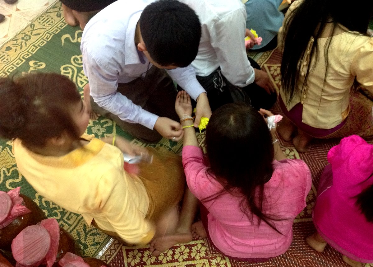 Après avoir allumé la bougie posée sur le sommet de la petit tour qu’évoquait Lang à l’instant, le maître de rituel - le représentant des étudiants - lit à haute voix des prières. Anousone, un autre étudiant : « Quand le maître de rituel termine le culte, on noue des fils de coton blanc autour du poignet de chacun des participants et en même temps, on leur adresse des vœux de santé, de chance et de bonheur pour la nouvelle année. Il y en a qui ont beaucoup de fils autour du poignet ! »