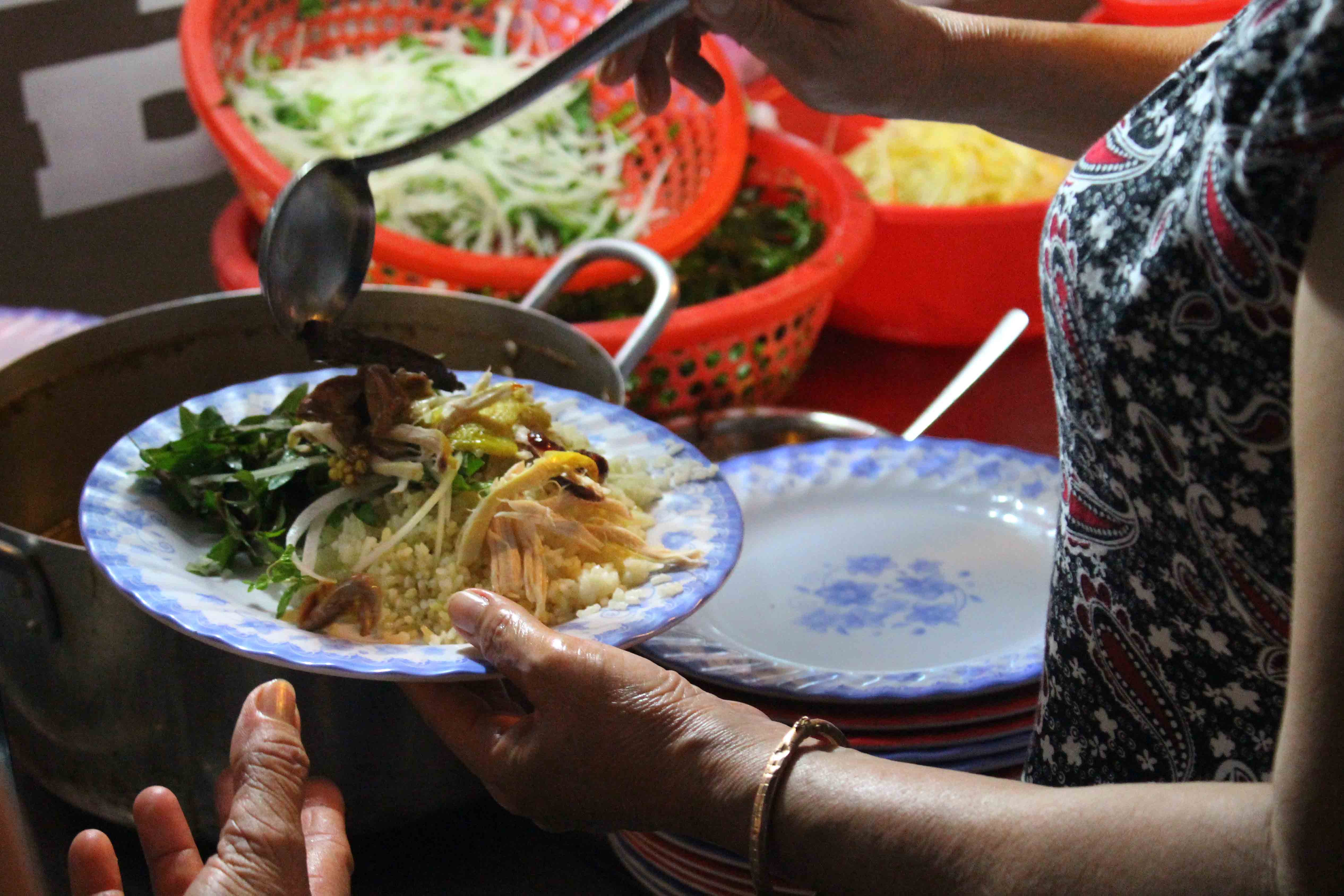 Selon Hương, le poulet que l’on utilise ne doit pas être plus grands que deux poings fermés. Il doit avoir une peau mince et une chair tendre. Après avoir été bouilli et déchiqueté, le poulet est mélangé avec de l’oignon émincé, des feuilles de persicaria odorata et un peu de sel et de poivre.