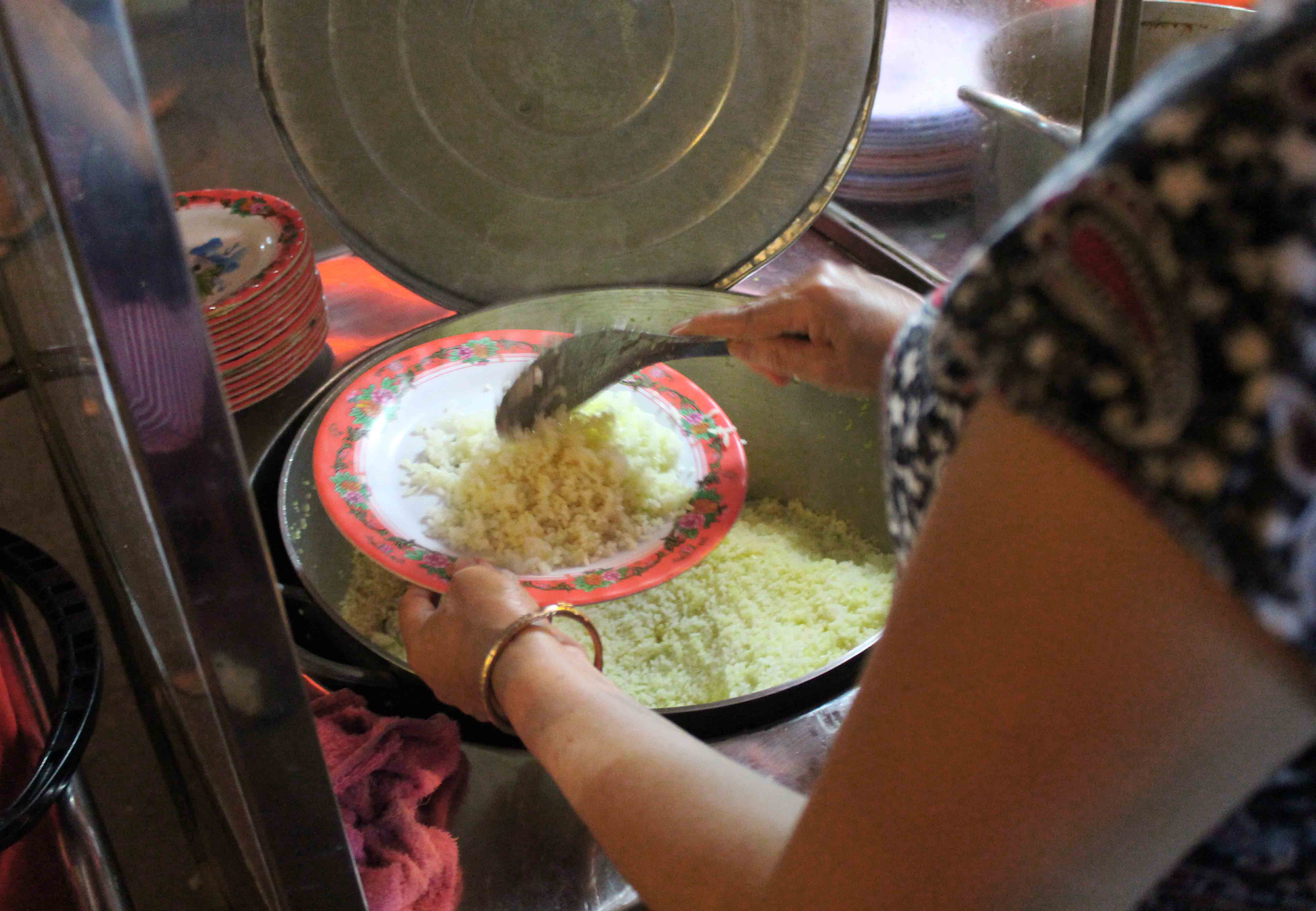 Nous sommes maintenant à côté de Hương qui est en train de préparer une assiette derrière la vitrine. Le jaune clair du riz, le rose pâle du poulet déchiqueté, le vert des feuilles persicaria odorata, le rouge et le blanc de la salade, toutes ces couleurs constituent un tableau attrayant sur l'assiette .