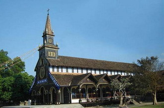 Sur les hauts plateaux ensoleillés, ventés et sous le ciel d’azur, se dresse depuis une centaine d’années cette église en bois qui force l’admiration de tous. Elle se trouve sur le boulevard Nguyên Huê. De loin, on peut voir sa tour de cloche en brun chatoyant qui se distingue sur le ciel d’azur des hauts plateaux du Centre. Lors de la construction de cet ouvrage, les artisans de Binh Dinh et de Quang Nam ont manuellement travaillé pendant 5 ans consécutifs avec des méthodes artisannales et une architecture mélangeant entre le style romain et celui des maisons sur pilotis de l’ethnie Banar. Il s’agit d’une interférence entre la culture européenne et celle des Hauts Plateaux du Centre Vietnam. Marine Hérault, une volontaire de l’organisation non-gouvernementale française Poussières de vie s’exclame: