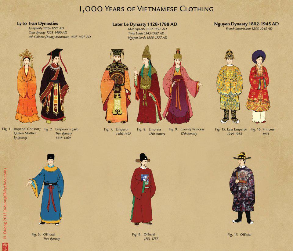 “En 1744, un événement historique a changé la façon de s’habiller des Vietnamiens vivant au sud de la province Thua Thien-Hue. Avant cette date, tous les Vietnamiens portaient le Ao giao linh, une robe à large pans, fermée diagonalement au niveau du cou. Ils laissaient aussi leurs cheveux tomber sur les épaules. Mais c’est le seigneur Nguyen Phuc Khoat, qui souhaitait se démarquer des Seigneurs Trinh du Nord, qui a décidé de modifier le costume national. Les Vietnamiens vivant sous son règne, hommes et femmes, devaient enrouler leurs cheveux et porter un ensemble constitué d’un pantalon et d’une tunique boutonnée sur le devant.”