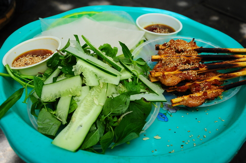 La recette ? Oui, bien sûr, une recette à deux composantes : le porc grillé et la sauce. Tram, qui tient une gargote depuis 8 ans, est une femme accueillante et ouverte. Elle nous détaille des différentes étapes de la préparation: « La viande coupée en tranches est assaisonnée avec du sel, du sucre, du poivre, mais aussi du miel, de la citronnelle et de l'oignon haché. Ensuite, je dispose cinq ou six morceaux sur des pinces de bambou et je fais griller le tout au-dessus du charbon de bois jusqu'à ce que la viande devienne brune.