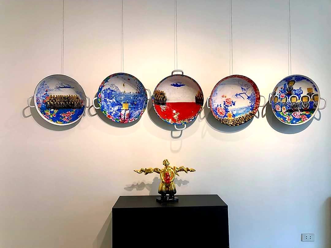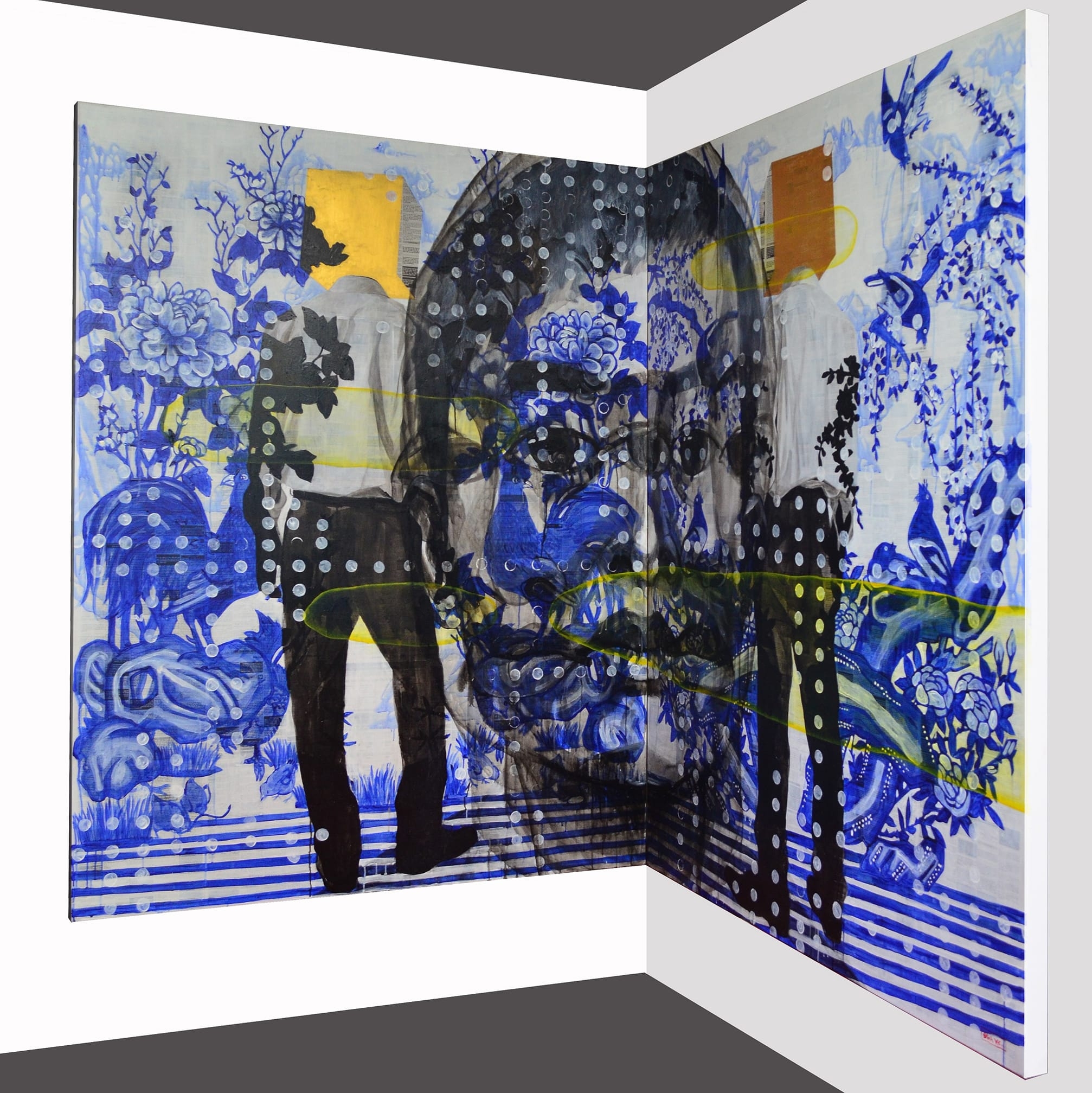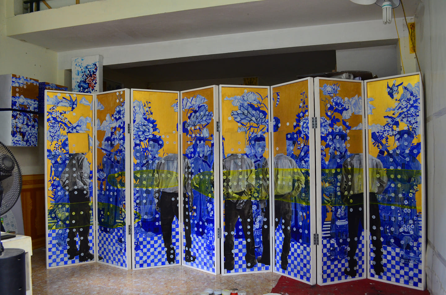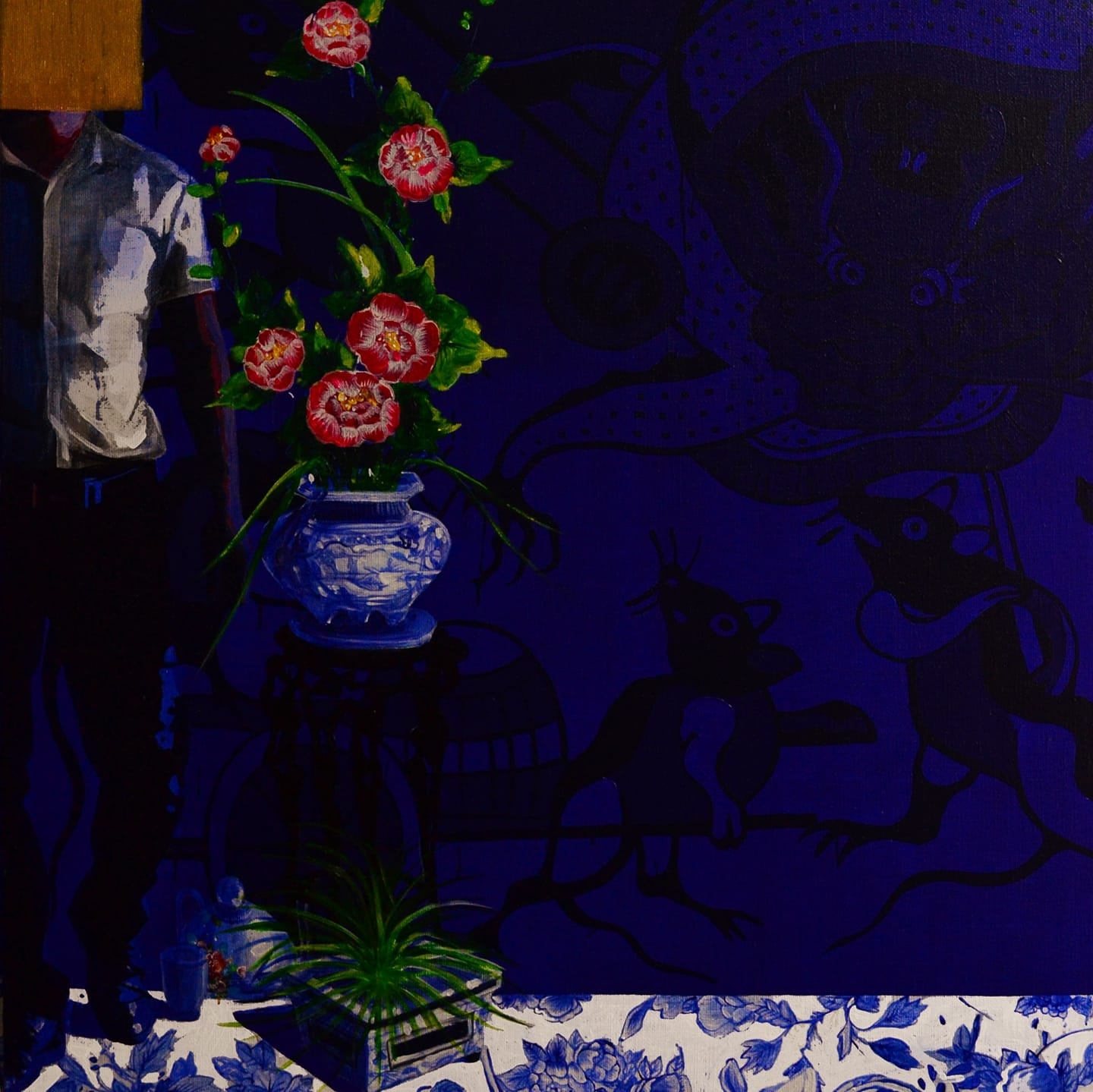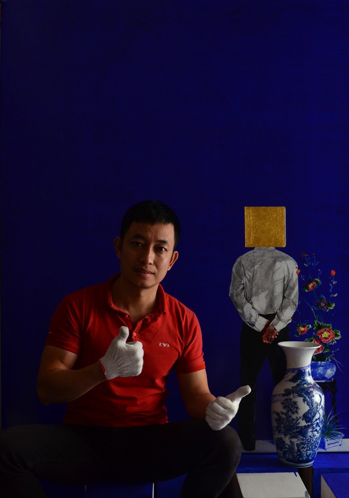 Si Yves Klein est devenu ultra célèbre grâce à son légendaire bleu cobalt, Nguyên Dinh Vu signe ses œuvres par le bleu sur la céramique traditionnelle vietnamienne. Ses tableaux se caractérisent par un contraste entre la tradition et la modernité, traduites respectivement par les motifs floraux ou animaliers typiquement vietnamiens et les hommes en costume noir.