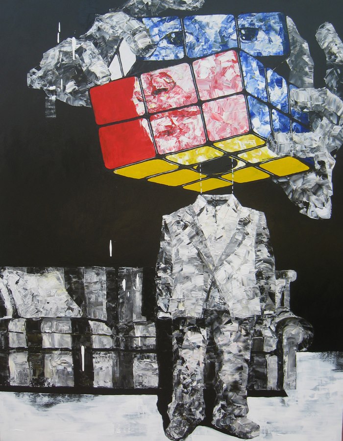 «On peut diviser mes créations en deux grands épisodes. Au début de ma carrière, je travaillais principalement sur le contraste de la lumière et sur les couleurs vives du Pop Art. Mes personnages étaient déjà en costume avec une tête de cube de rubik. L’ambiance était un peu noire et sombre. Actuellement, je travaille sur le bleu comme nuance principale, avec des personnages à la tête toujours cubique, mais dorée», a-t-il expliqué.