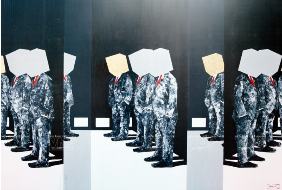 Vu impressionne le public par des tableaux de grand format ou en collection de trois à cinq pièces. «Au Vietnam, Vu est rare. Il développe un seul sujet, qui est le contraste entre la tradition et la modernité, sous différents angles. Dans son travail, on voit plein de dualités, par exemple la violence et la douceur, la rigidité et l’élégance. Personnellement, je ne supporte pas le bleu en général, mais la couleur qu’il propose me séduit. C’est gracieux, doux et tranquille», a affirmé Binh Minh, collectionneur et admirateur de Nguyên Dinh Vu.