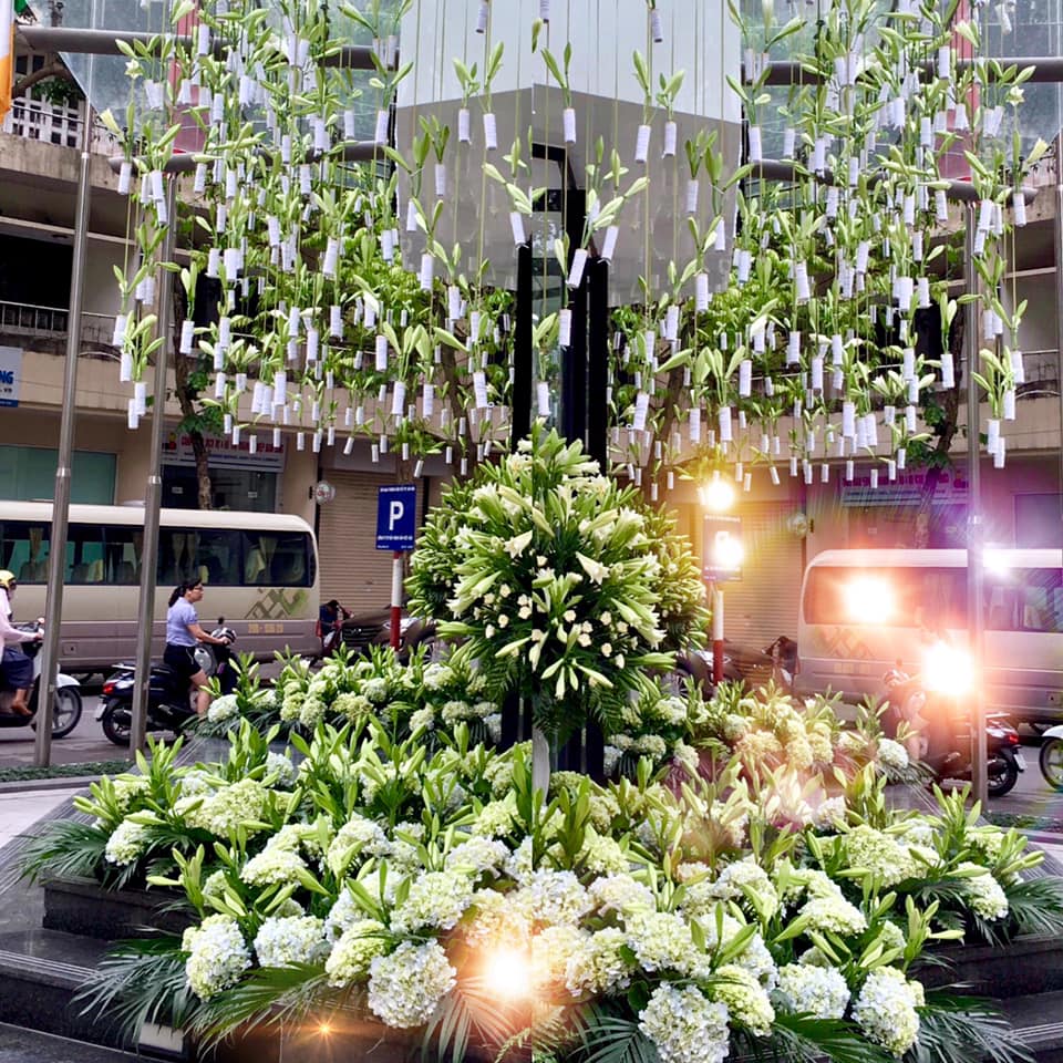 Une des compositions florales de Nguyên Manh Hùng exposée dans le centre - ville de Hanoi
