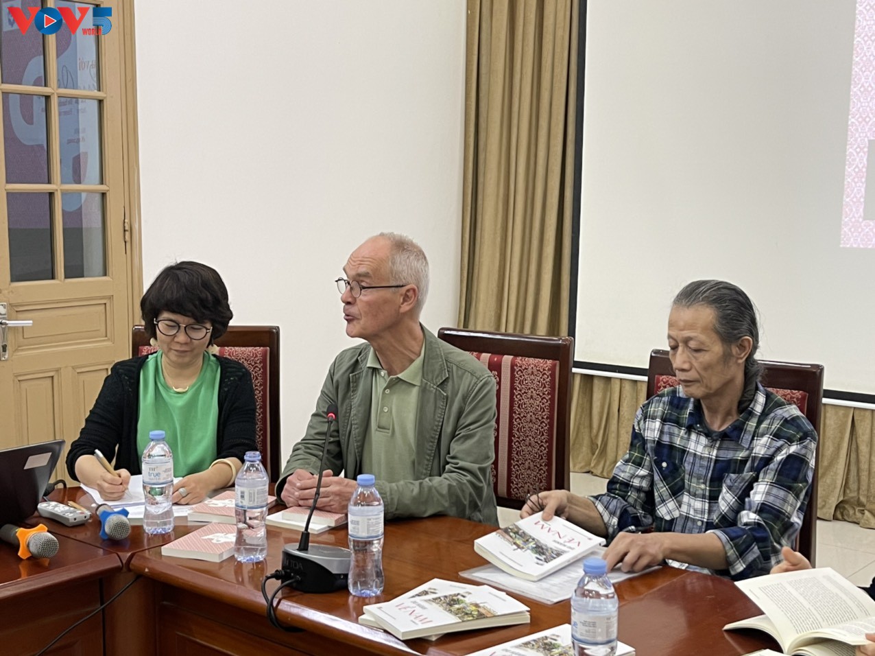 L'auteur Jean-Pierre Ouster (au milieu) et Nguyên Tri Dung, directeur de Sao Bac-Media (droite). Photo: Thuy Linh |