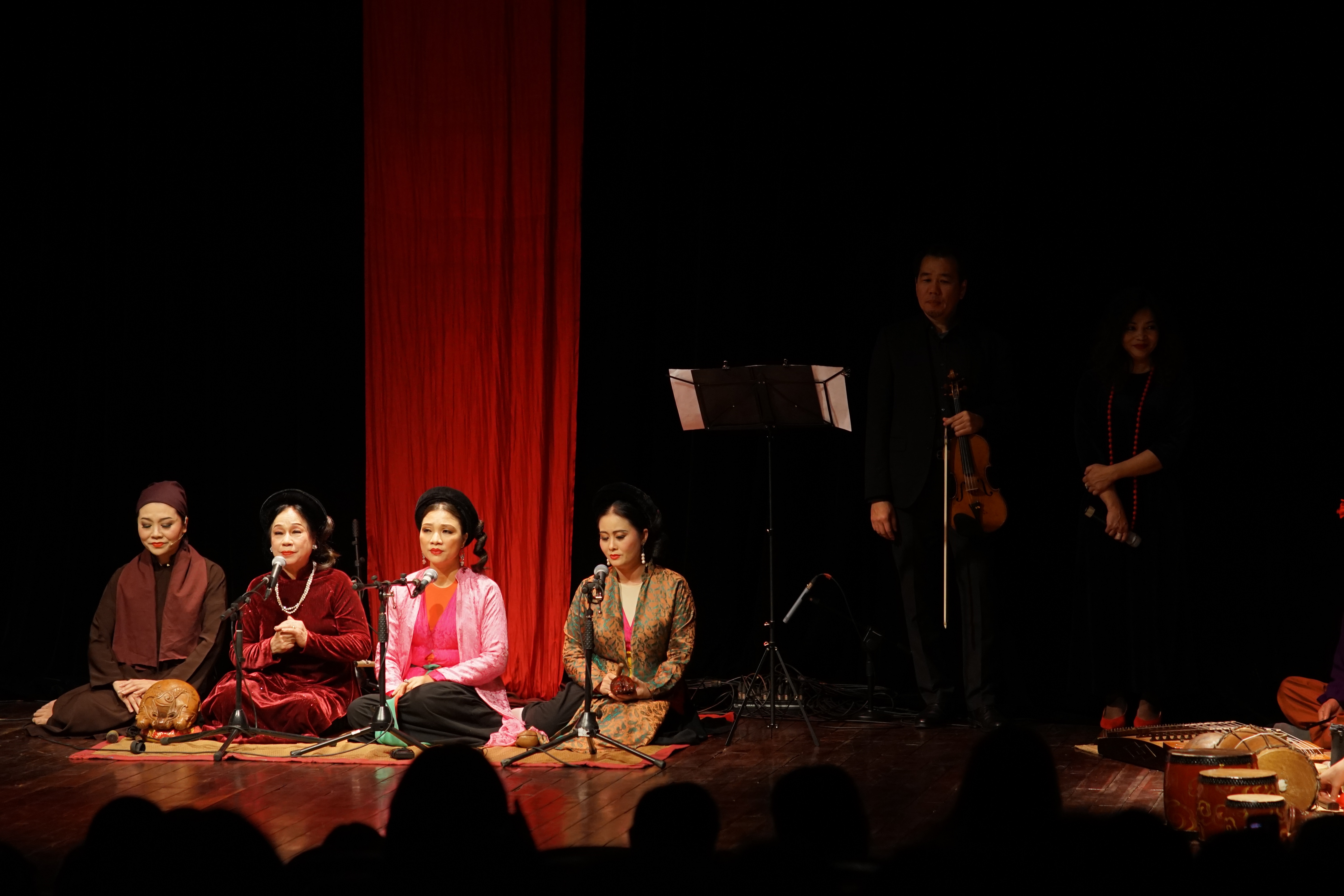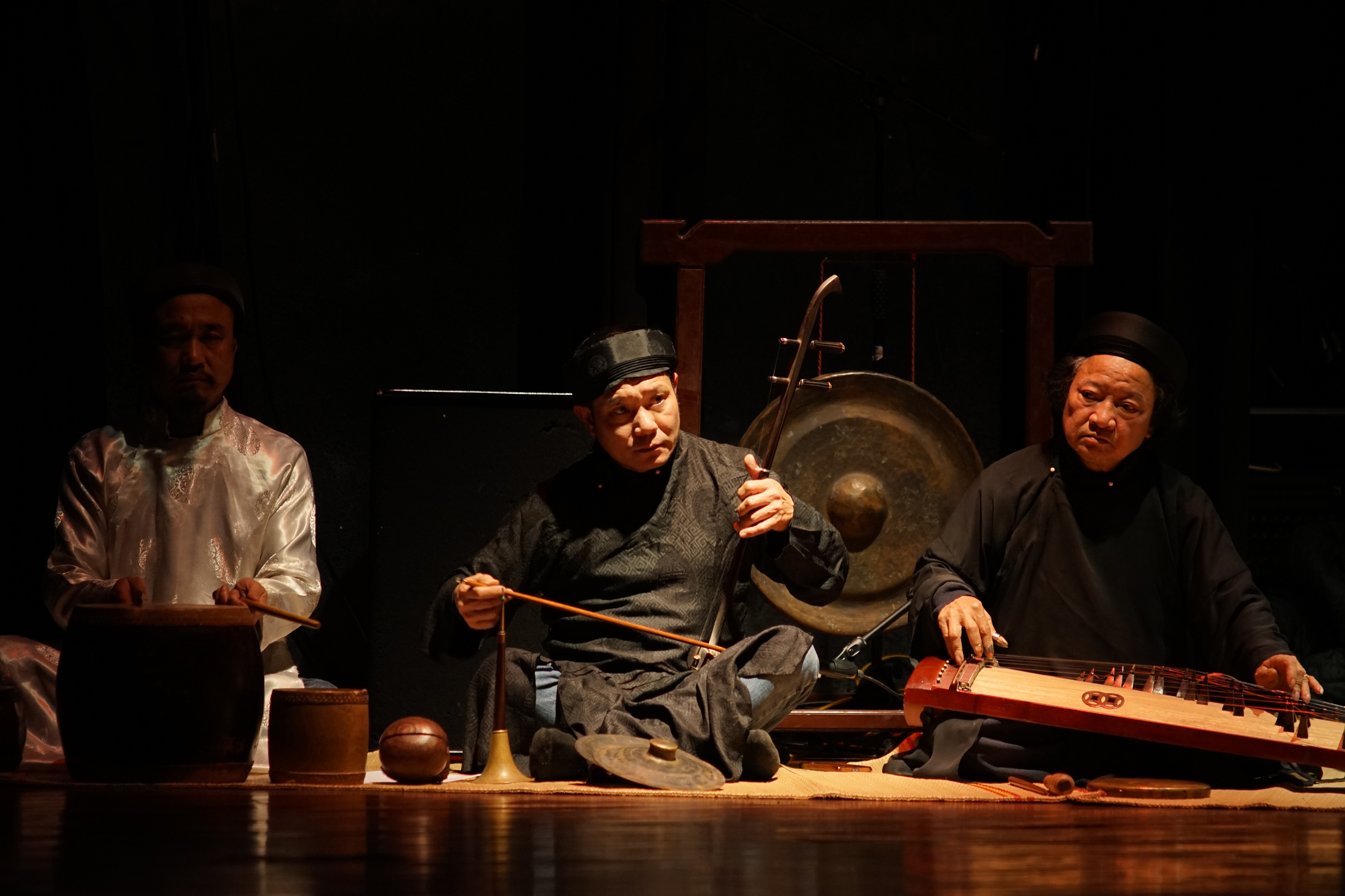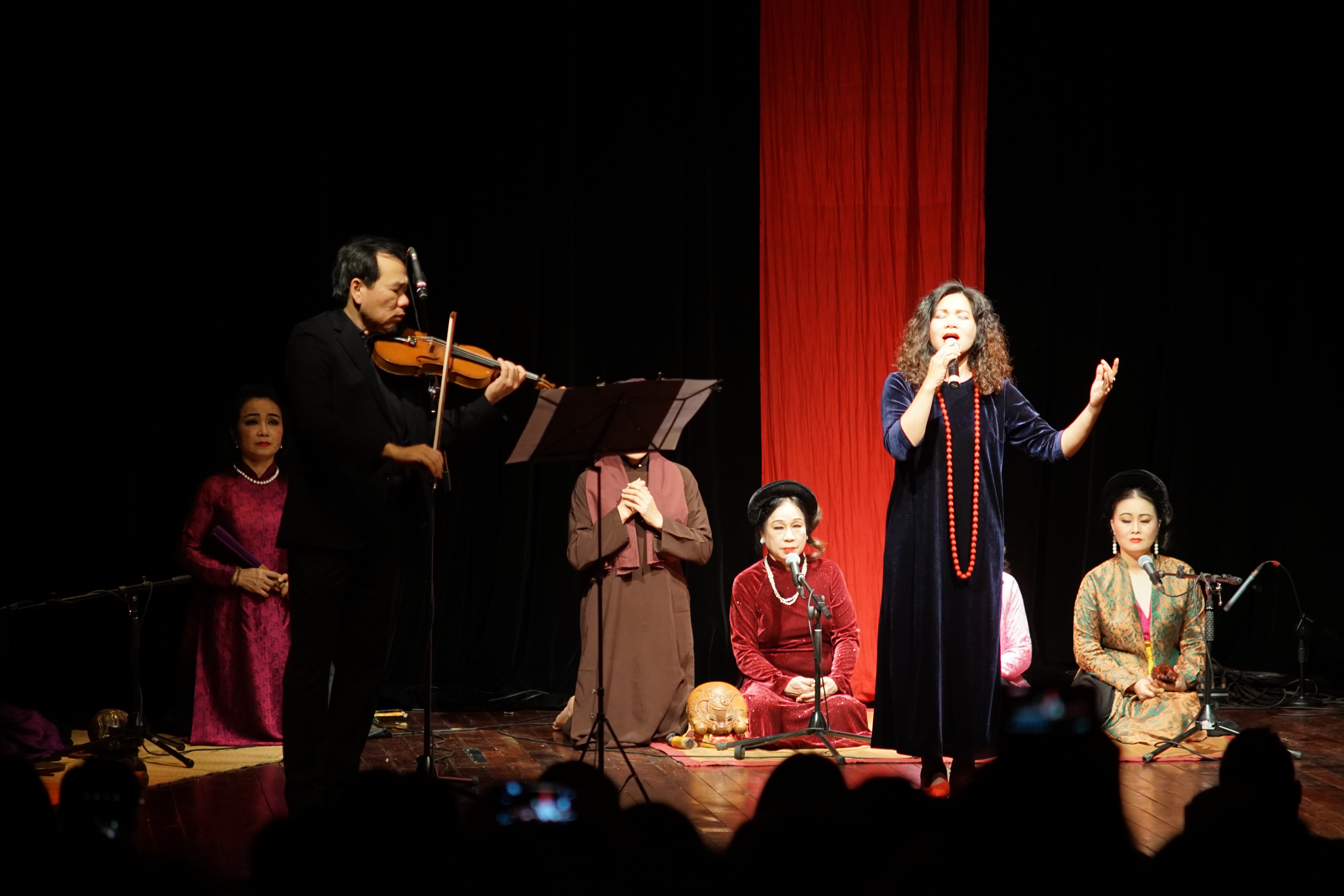 Portant sur le thème de Thang Long, le concert, intitulé «1011-2021» est comme une sorte de grand festin de musique traditionnelle. On y trouve du Ca trù (une forme de poésie chantée), du Tuông (une forme de théâtre classique), du Hat xâm (une forme de musique folklorique interprétée autrefois par des malvoyants), du Chèo (un genre théâtral populaire)... Mais attention, les œuvres présentées le sont dans un ordre bien précis, comme nous l’explique Dàm Quang Minh, le fondateur du groupe Dông Kinh Cô Nhac.