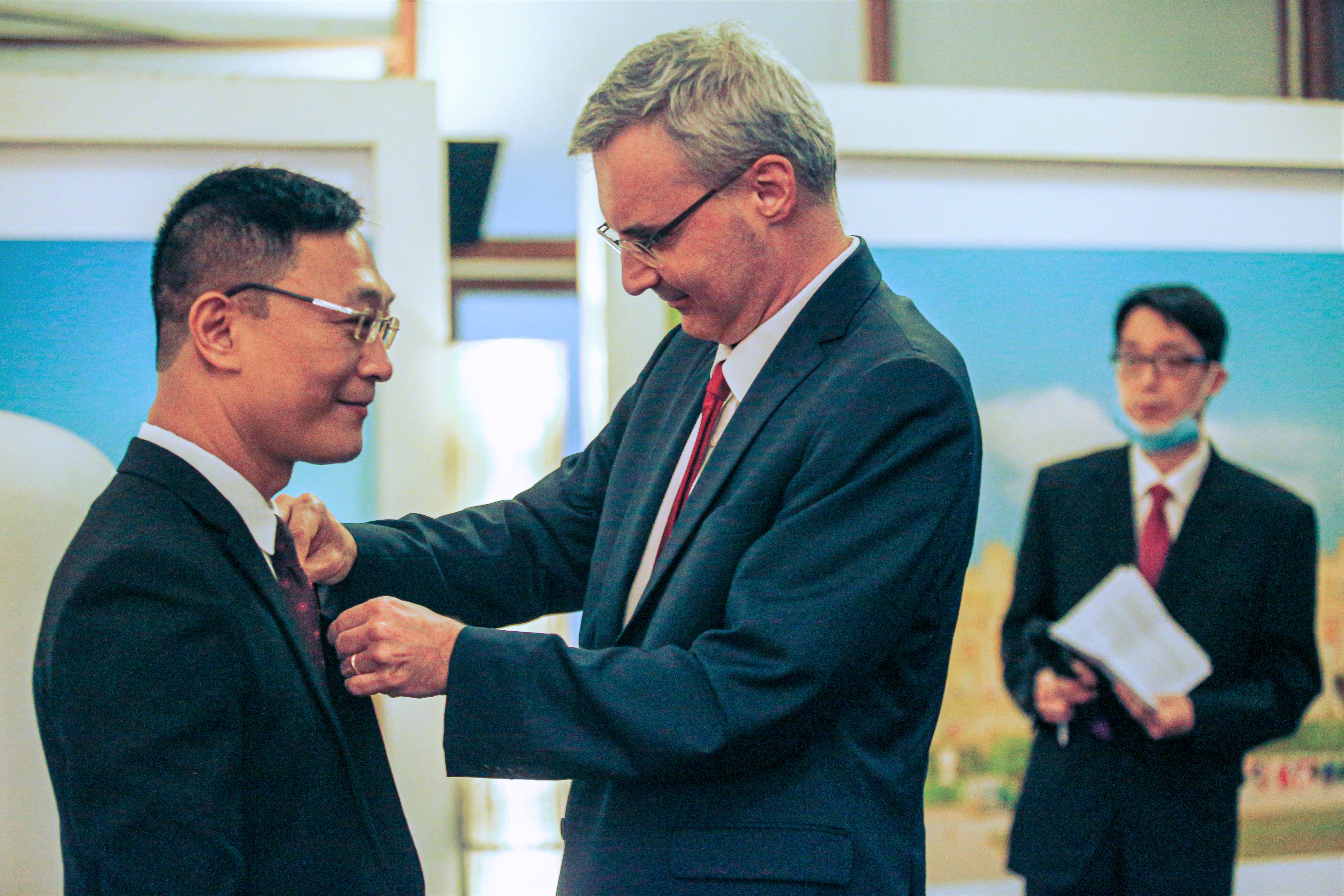 La remise des insignes de chevalier de l’ordre des Arts et des Lettres à Trân Van Công (gauche) à l'Ambassade de France. Photo: AFV |