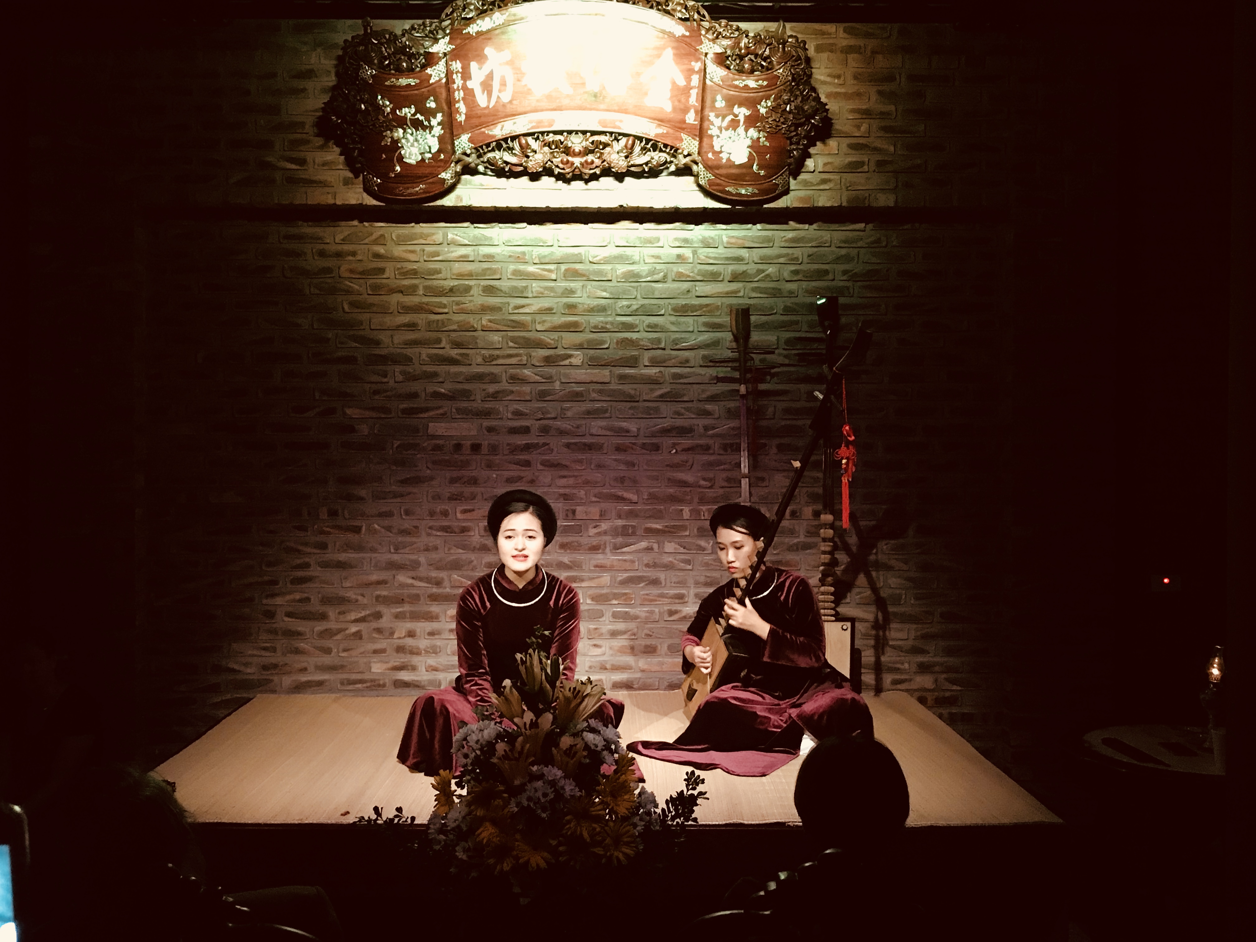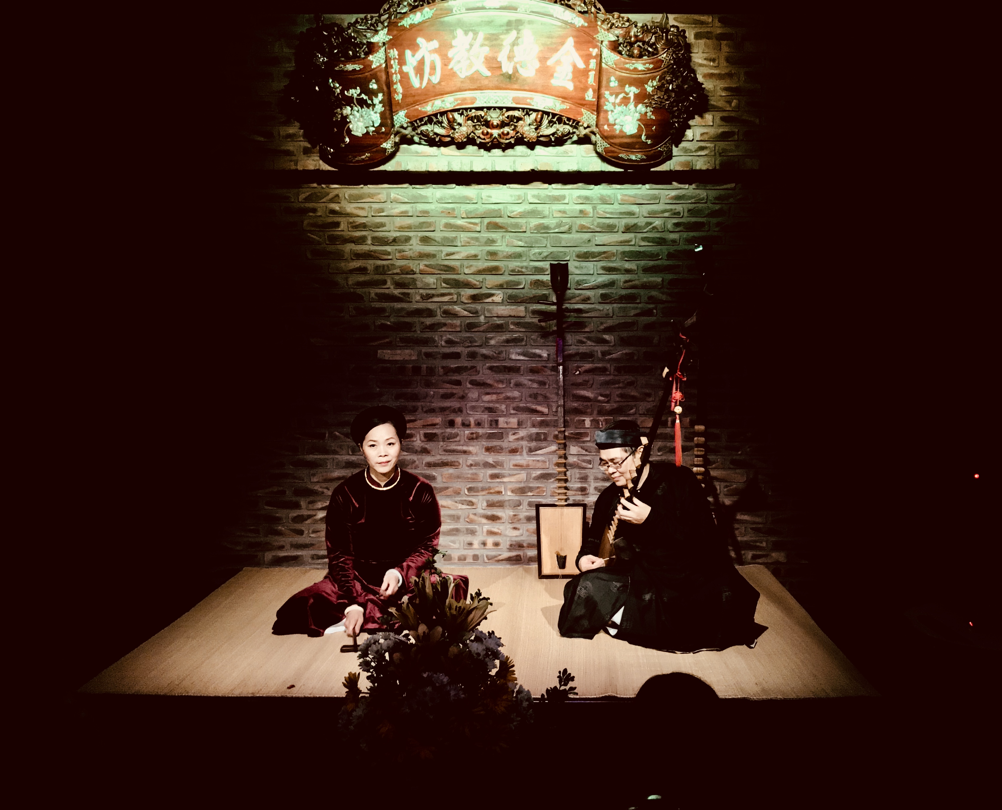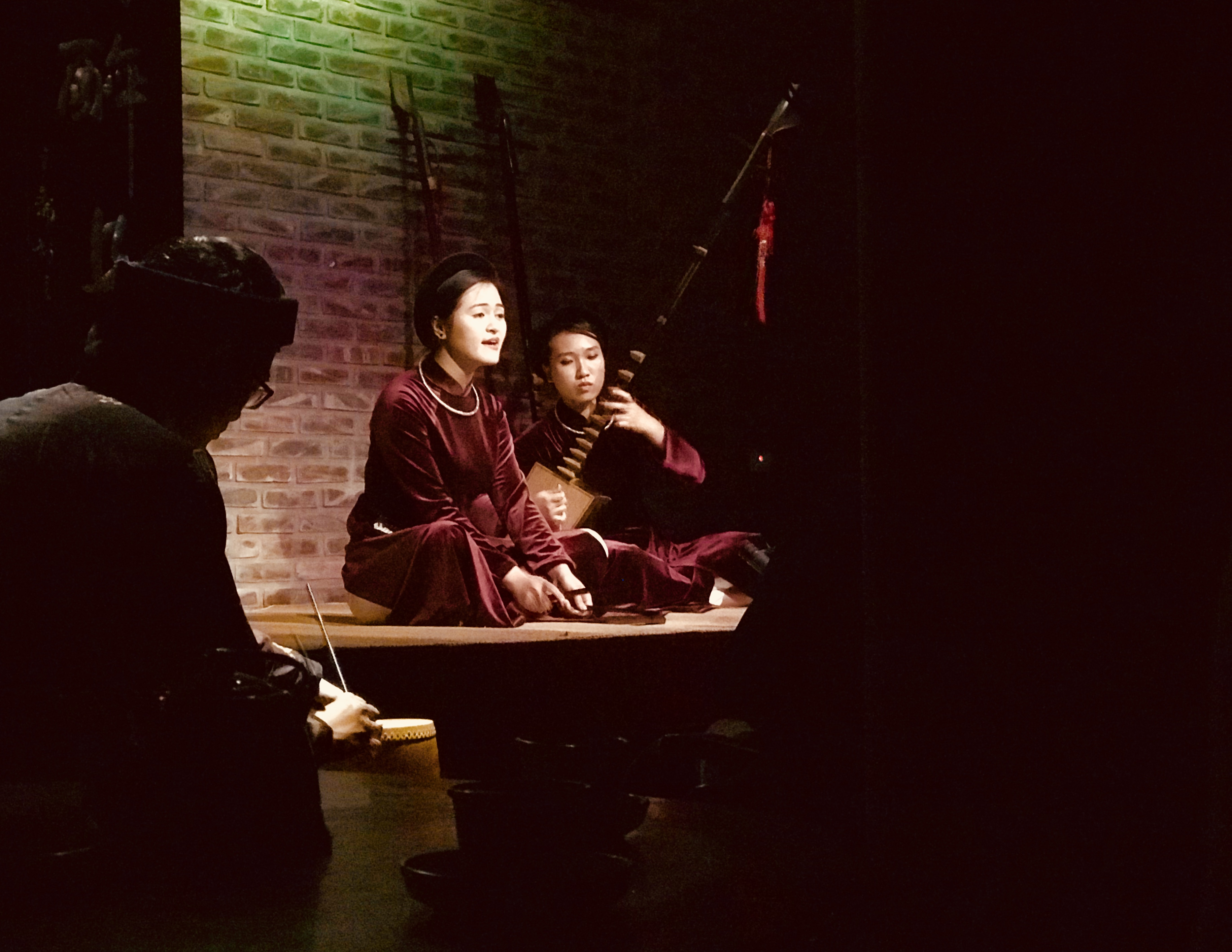 Sur la «scène», qui consiste en fait en une natte déposée au milieu de la salle, une chanteuse habillée en «áo dài» de velours bordeaux, chante de beaux poèmes anciens, scandés par une claquette de bois, le «phách», qu’elle tient dans ses mains. A côté d’elle se trouvent deux instrumentistes. L’un joue du tambour, le «châu», et l’autre d’une cithare rectangulaire à trois cordes, le «đáy».