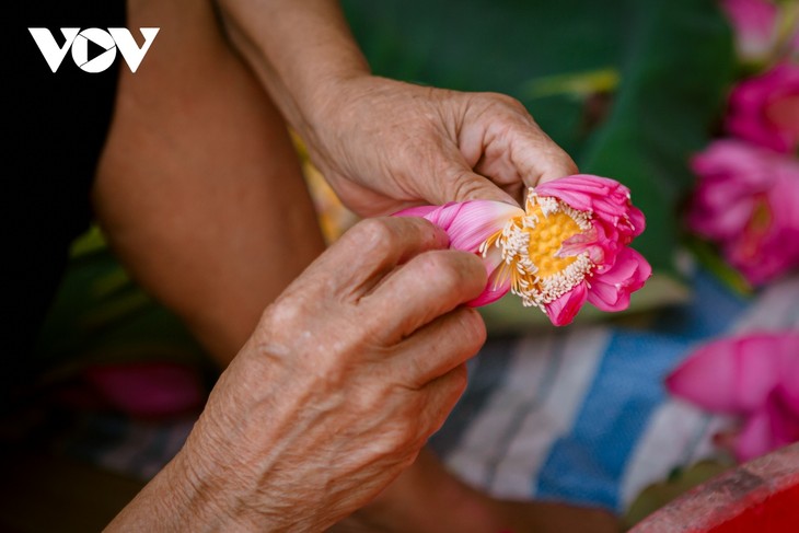 Il y a deux façons de parfumer le thé, une rapide et une longue. La façon rapide consiste à mettre directement le thé à l’intérieur d’une fleur de lotus. L’artisan emballe la fleur avec une feuille et continue de la planter dans l’eau pendant quelques heures. Par la suite, il coupe la fleur, la met dans un sac sous vide et la conserve dans le congélateur. Ce type de thé se vend 80.000 dôngs (3 euros) la fleur, soit l’équivalent du contenu d’une théière.