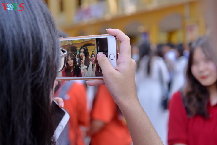 Dans la cour du lycée Viêt Duc, un fond en grand format avec des milliers de signature et de voeux des élèves de terminale.