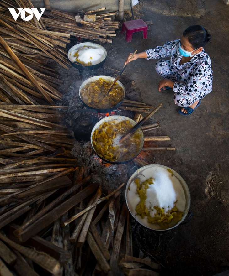 Elles sont ensuite bouillies, égouttées et cuites avec du sucre. La cuisson est l’étape cruciale qui décide de la qualité du produit fini. Elle doit s’effectuer au feu de bois. Il faut remuer régulièrement et veiller à ce que les tranches ne collent pas les unes aux autres.