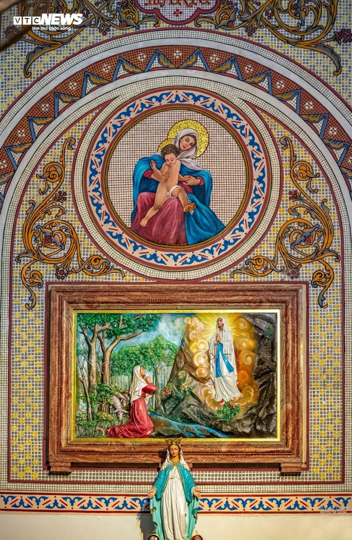 L'omniprésence du doré dans les bas-reliefs et les mosaïques n'est pas un choix purement esthétique. Dans l'iconographie byzantine héritée de Constantinople, l'or représente la lumière céleste et la toute-puissance divine. À Hanh Thông Tây, cette tradition est respectée avec une fidélité remarquable: sous la lumière oblique qui traverse les vitraux colorés, le revêtement doré scintille et paraît «vivre» - transformant chaque heure de la journée en une expérience lumineuse distincte.