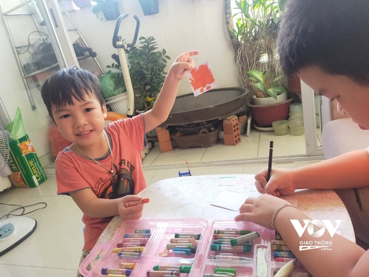 Dans un bâtiment du quartier d’An Phu (Thu Duc), alors que les adultes confectionnent 200 repas pour les hôpitaux de campagne, les enfants souhaitent eux aussi encourager les personnes en première ligne.