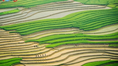 (VOVWORLD) - Quand on parle des rizières en terrasse de Mu Cang Chai, on pense tout de suite au jaune du riz mûr qui s’étend à l’infini. Mais si vous y passez ces jours-ci, en pleine saison de repiquage, vous serez tout aussi émerveillés par le paysage multicolore offert par ces rizières.