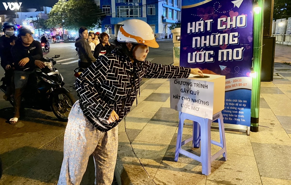 Même ambiance, mais cette fois devant la porte de la Maison culturelle de la jeunesse de la province de Ba Ria - Vung Tau, au coin de la route côtière Ha Long - Truong Công Dinh. Tous les mercredi soir, le concert philanthropique «Chanter pour les rêves» attire des foules. Phu, un pianiste, nous explique…