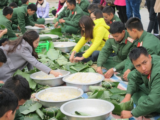 | Les jeunes de la cité municipale de Son Tay et des étudiants de l’Ecole des officiers de l’infanterie I confectionnent les banh chung Photo: thanhtra.com |