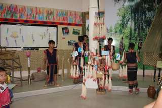 Revenons un peu sur terre, ce n’est tout de même à Kon Tum Ko Pang que nous sommes, mais bel et bien à Hanoi, au musée d’ethnographie. Mais il faut reconnaître que telle qu’elle est conçue, cette nouvelle salle d’exposition encourage l’évasion. On y trouve en fait plein d’objets collectés par les jeunes sonneurs de gong du village de Kon Tum Ko Pang: des hottes, des gongs bien sûr, des vêtements traditionnels… Il y a même une maison reconstituée… Avec tout ça, difficile de ne pas se croire chez les Banars !