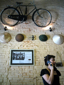 Le restaurant d’Etat numéro 37, donc: 80 mètres carrés de superficie et une atmosphère d’après-guerre, de temps de pénurie. Rien ne manque: les files pour les achats, délimitées par des murets de briques, les tickets de rationnement, les vélos « Thong Nhat » - les vélos de la réunification, en français - les gobelets et les grands bols d’acier émaillé. Même les serveuses apportent une touche d’authenticité avec leur pantalon noir et ample et leur tunique ajustée, façon maquisarde! Pas très à la mode tout ça, me direz-vous, mais qu’importe! Pour le maître de céans, un certain Pham Quang Minh, la cinquantaine passée, l’ouverture de ce restaurant aura été un projet de longue haleine. Il lui a d’abord fallu collecter un certain nombre d’objets datant de ces années héroiques: un vieux poste de radio, un ventilateur soviétique à oreilles d’éléphants et même un magnétophone à cassettes de la marque Viettronics!...