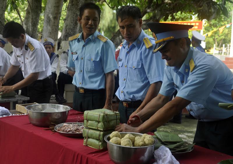 Les feuilles de phrynium bien lavées et coupées sont disposées dans les moules. Les ficelles de bambou sont déjà trempées dans l’eau, ce qui les rend plus souples. Quant aux haricots mungos, ils sont cuits, pilés et tassés en boule. Tout est prêt. Sous les mains habiles des soldats, en à peine cinq minutes, un gâteau est fait. Mais il faut savoir que sur les îles de Truong Sa, outre les feuilles de phrynium, on utilise aussi des feuilles de bàng vuông, un badamier typique des îles de l’océan indien et du Pacifique Ouest dont le nom scientifique est Barringtonia asiatica. Le capitaine Le Dang Sang: